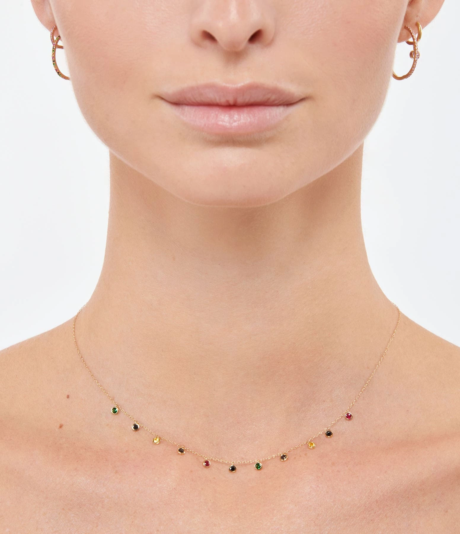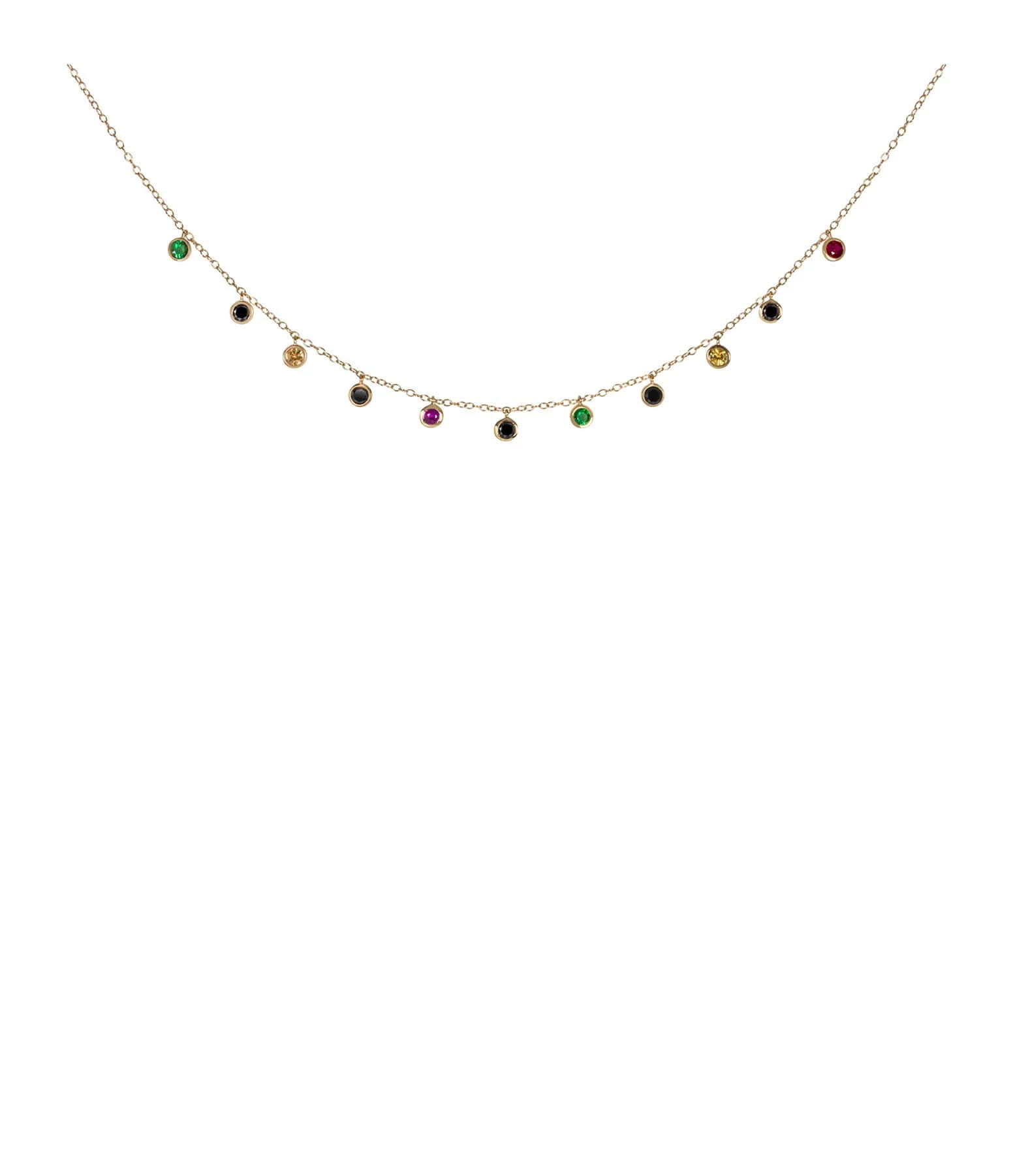 Collier court en or jaune avec 11 pierres serti clos : rubis, diamant noir, tsavorite et citrine.