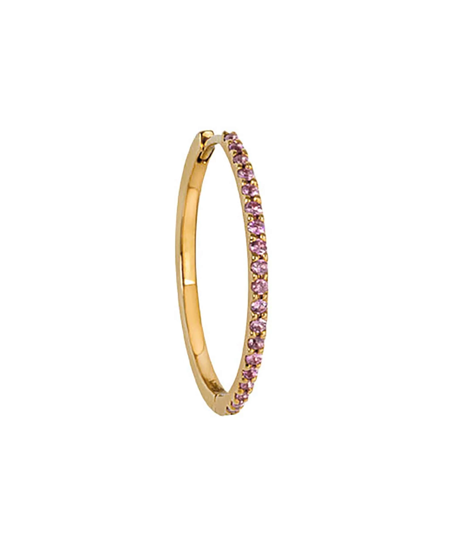 Boucle d’oreille créole large en or jaune demi pavée de saphirs roses. Vendue à l’unité.