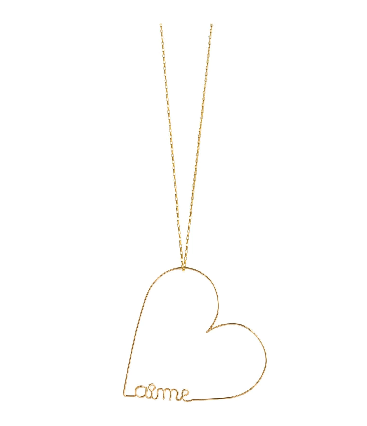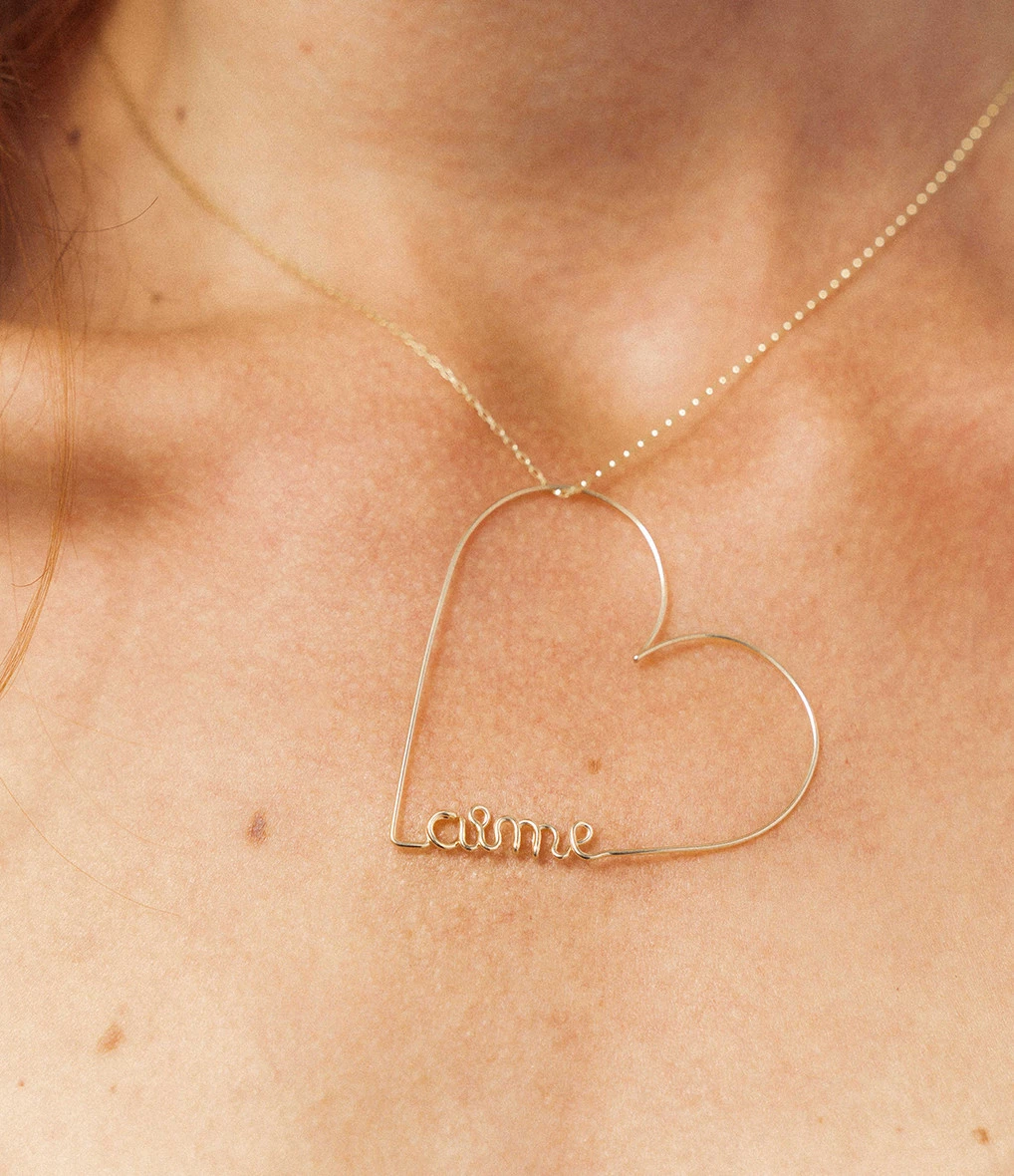 Collier sur chaîne en or gold filled avec un pendentif composé d’un cœur avec l’intitulé « Aime » inscrit à l’intérieur. Fermoir classique à ressort avec contre anneau.