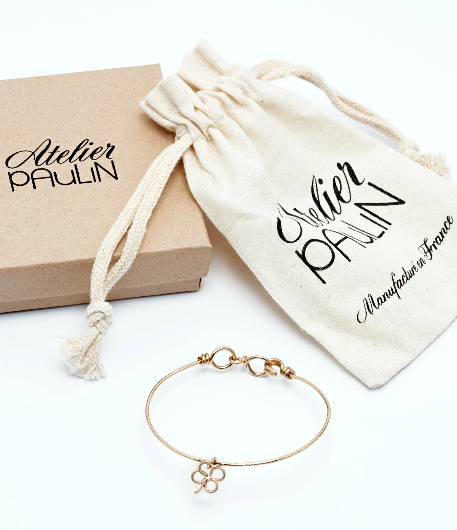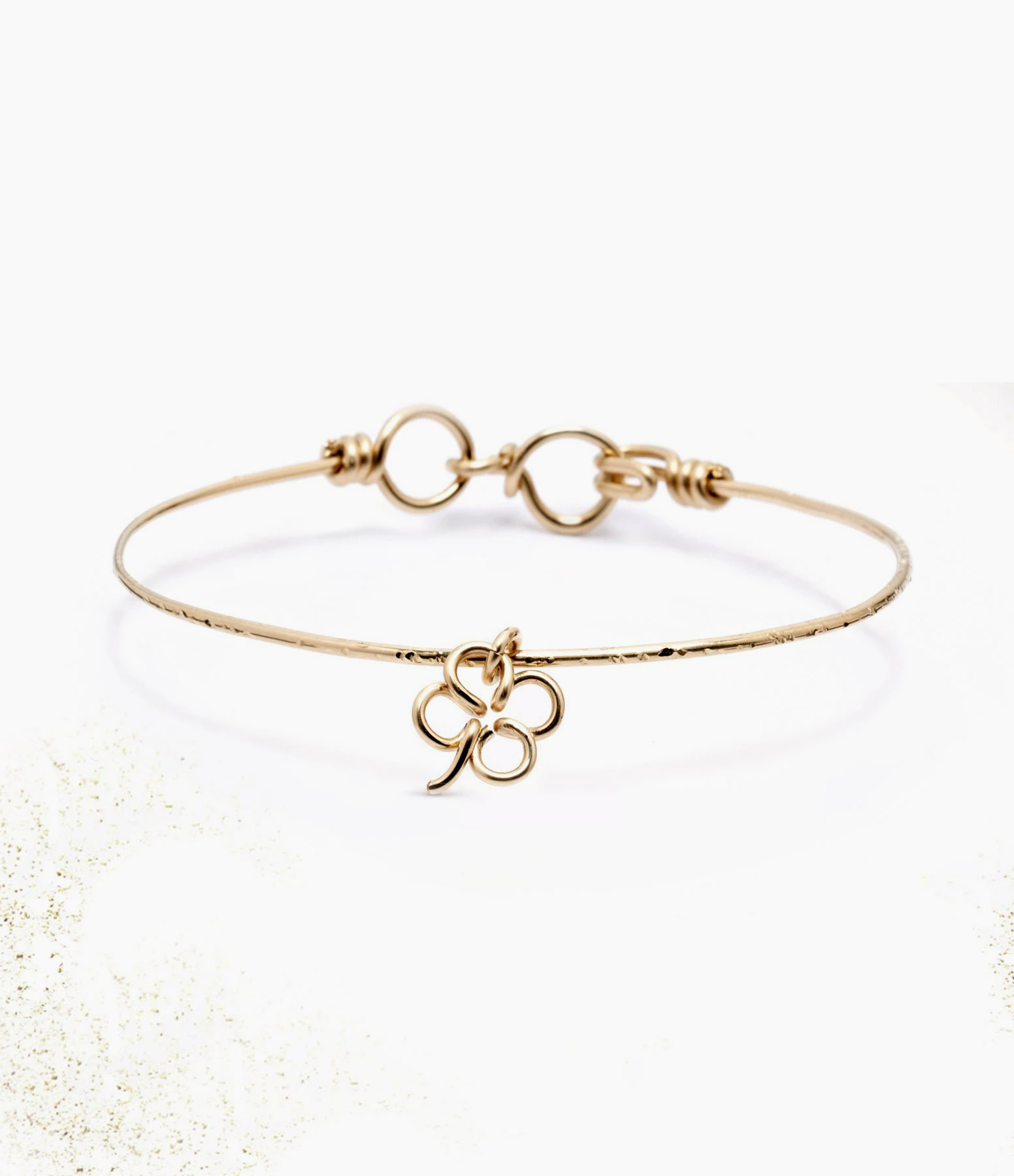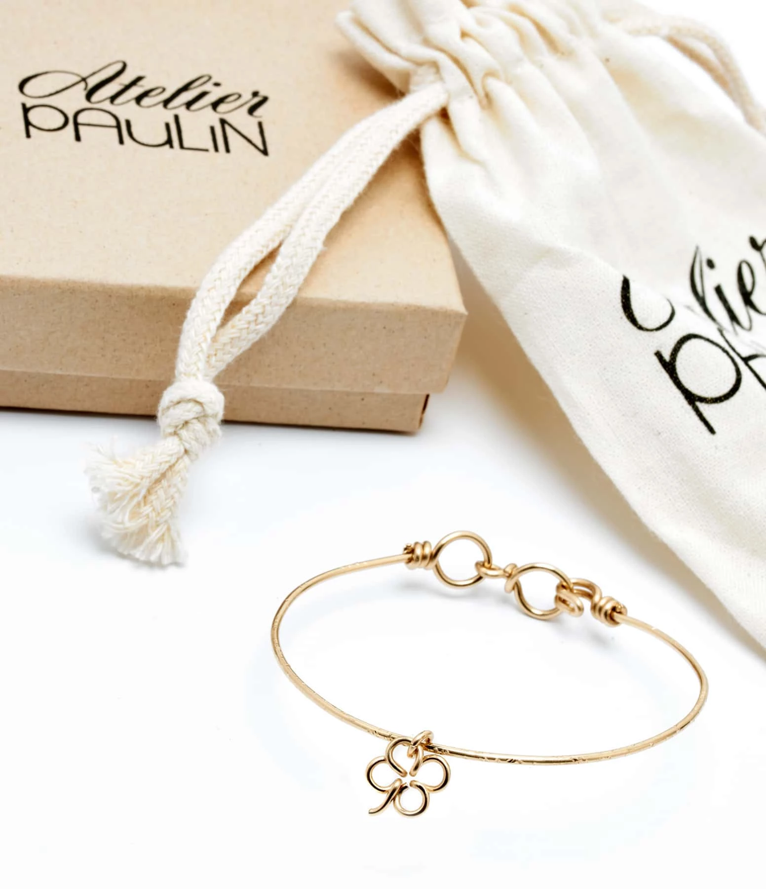 Bracelet jonc, composé d’un seul et même fil d’or gold filled martelé, agrémenté d’un charm « Trèfle » emblématique de Lulli. Se porte ajusté.