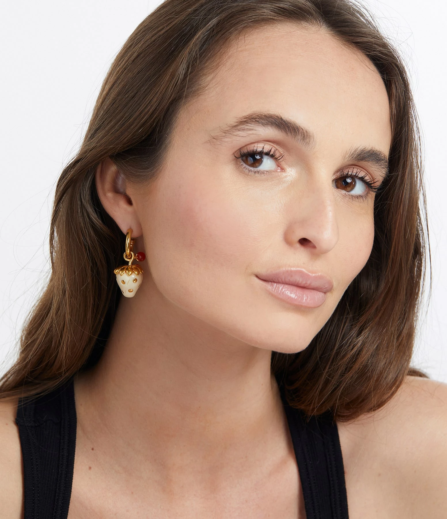 Boucle d’oreille créole ornée d’une fraise en bakélite ivoire et inclusions dorées, et d’une petite cornaline. Fermoir poussette.