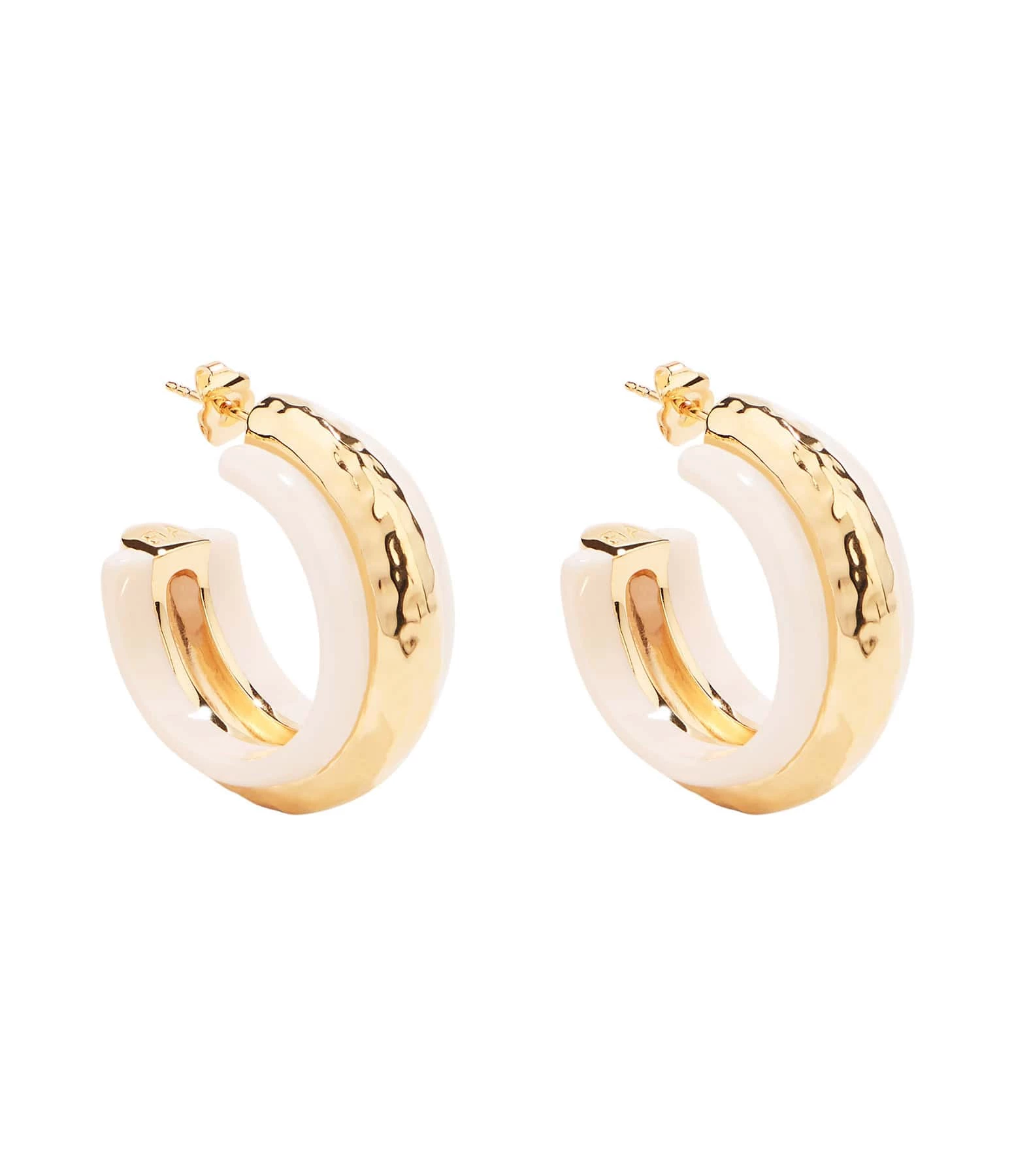 Boucles d’oreilles en bakélite ivoire avec détails dorés martelés. Fermoirs poussettes.