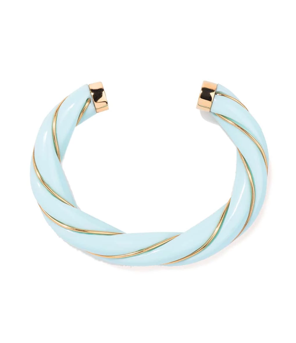 Bracelet jonc torsadé en bakélite bleu bébé, parcouru d’un fil doré. Jonc rigide, non réglable.