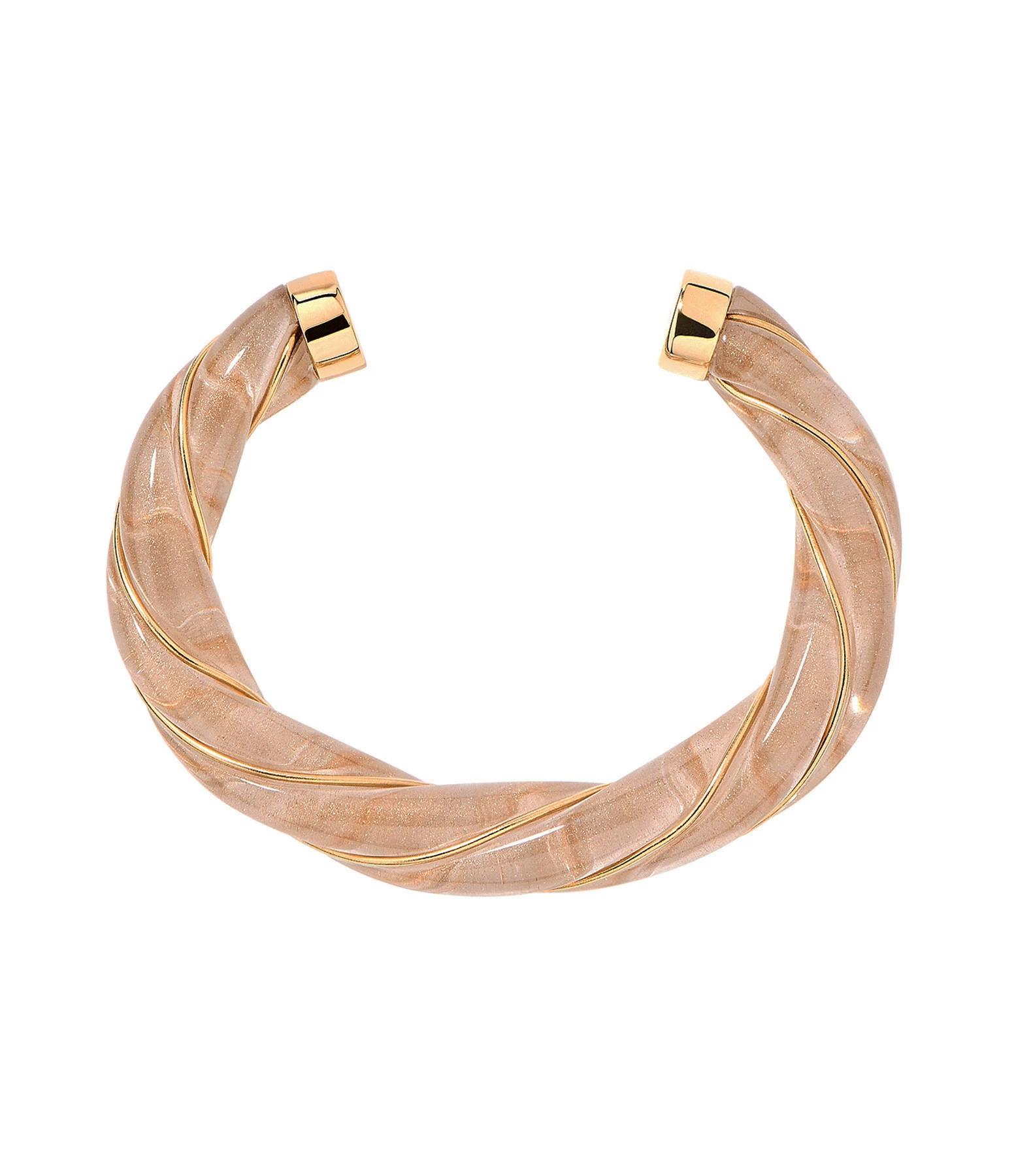 Bracelet jonc torsadé en bakélite transparente finement pailletée, parcouru d’un fil doré. Jonc rigide, non réglable.
