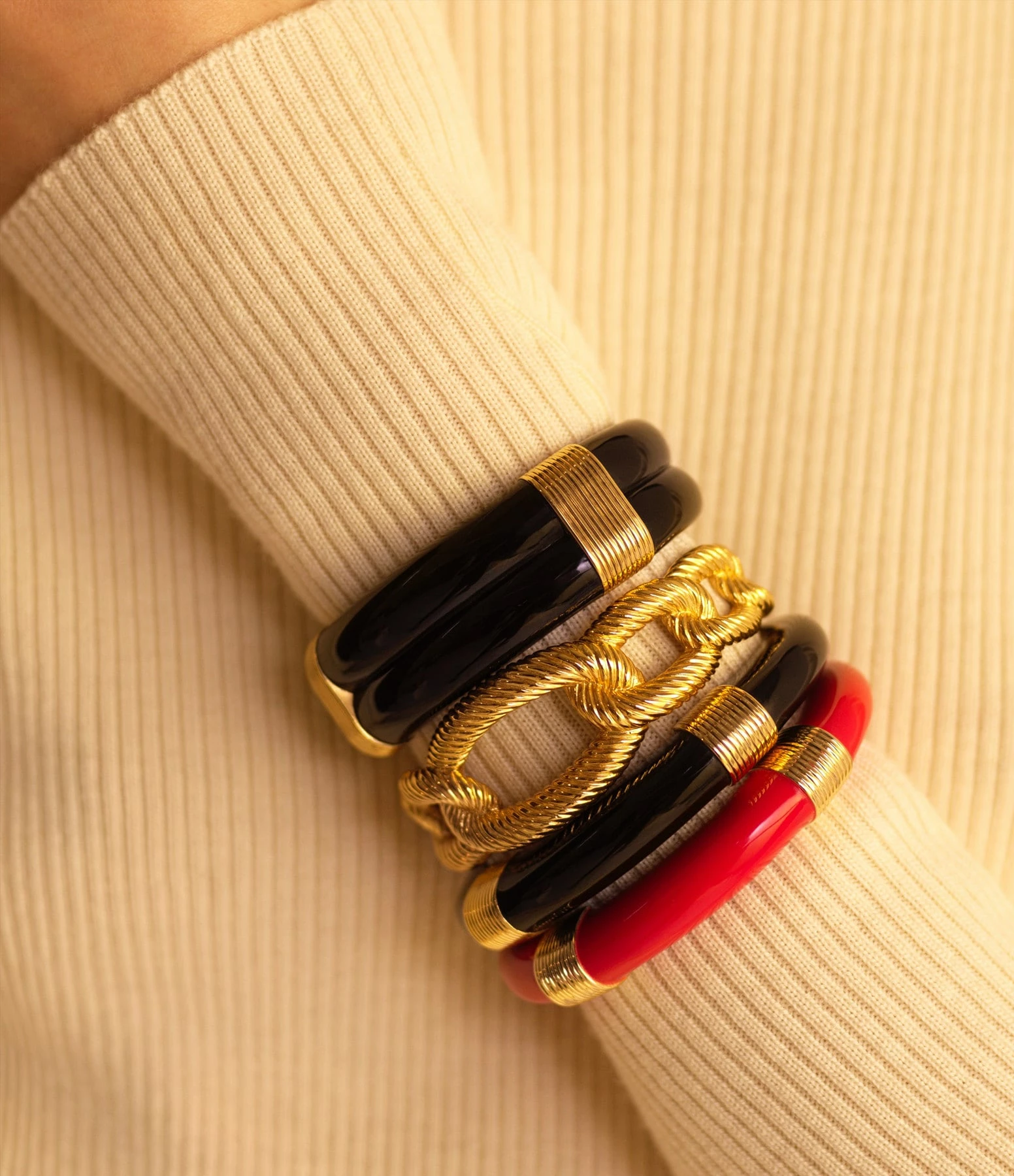 Bracelet jonc en bakélite noire, avec détails striés dorés. Jonc rigide, non réglable.