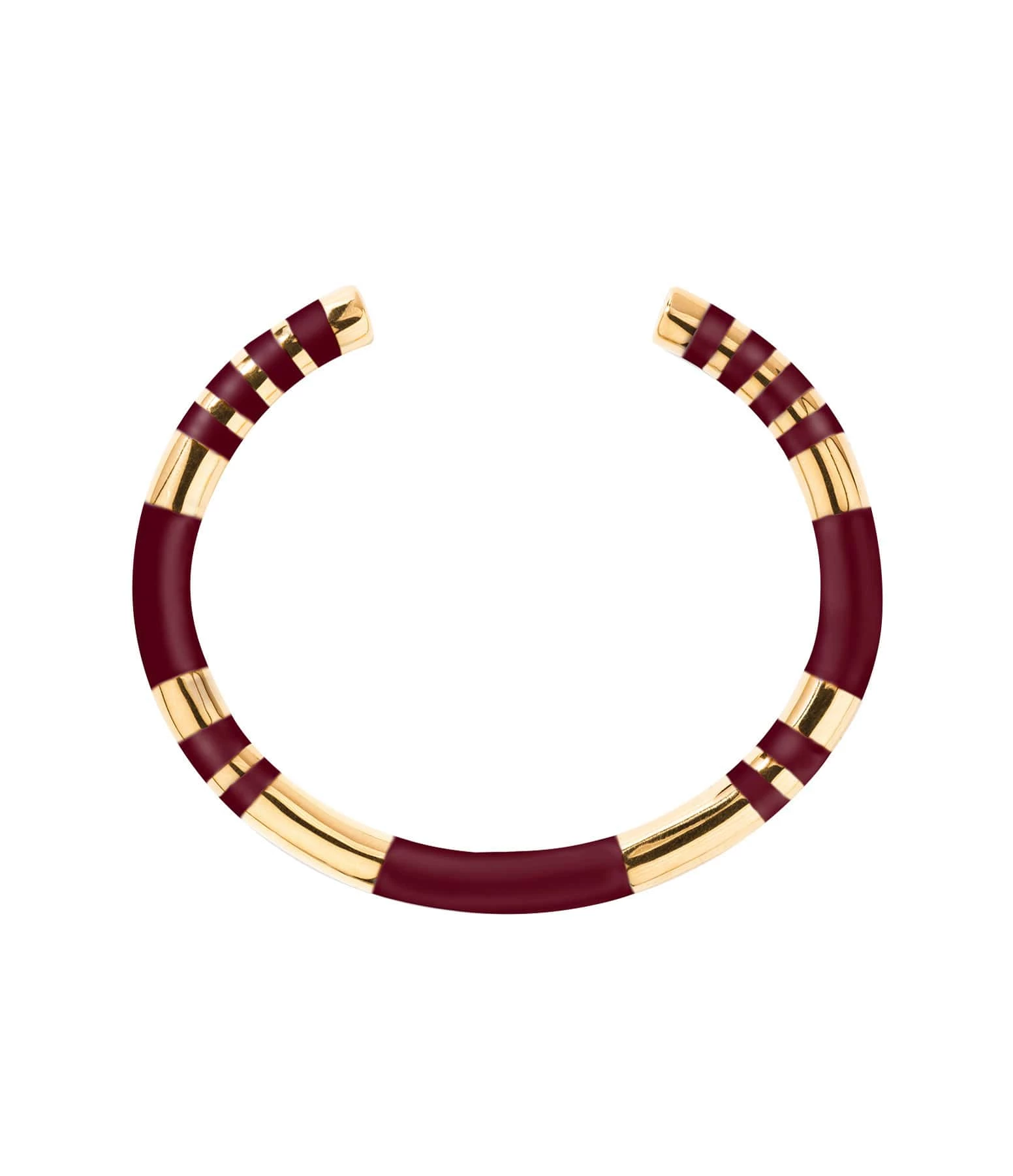 Bracelet jonc doré avec rayures en bakélite bordeaux. Jonc rigide, non réglable.