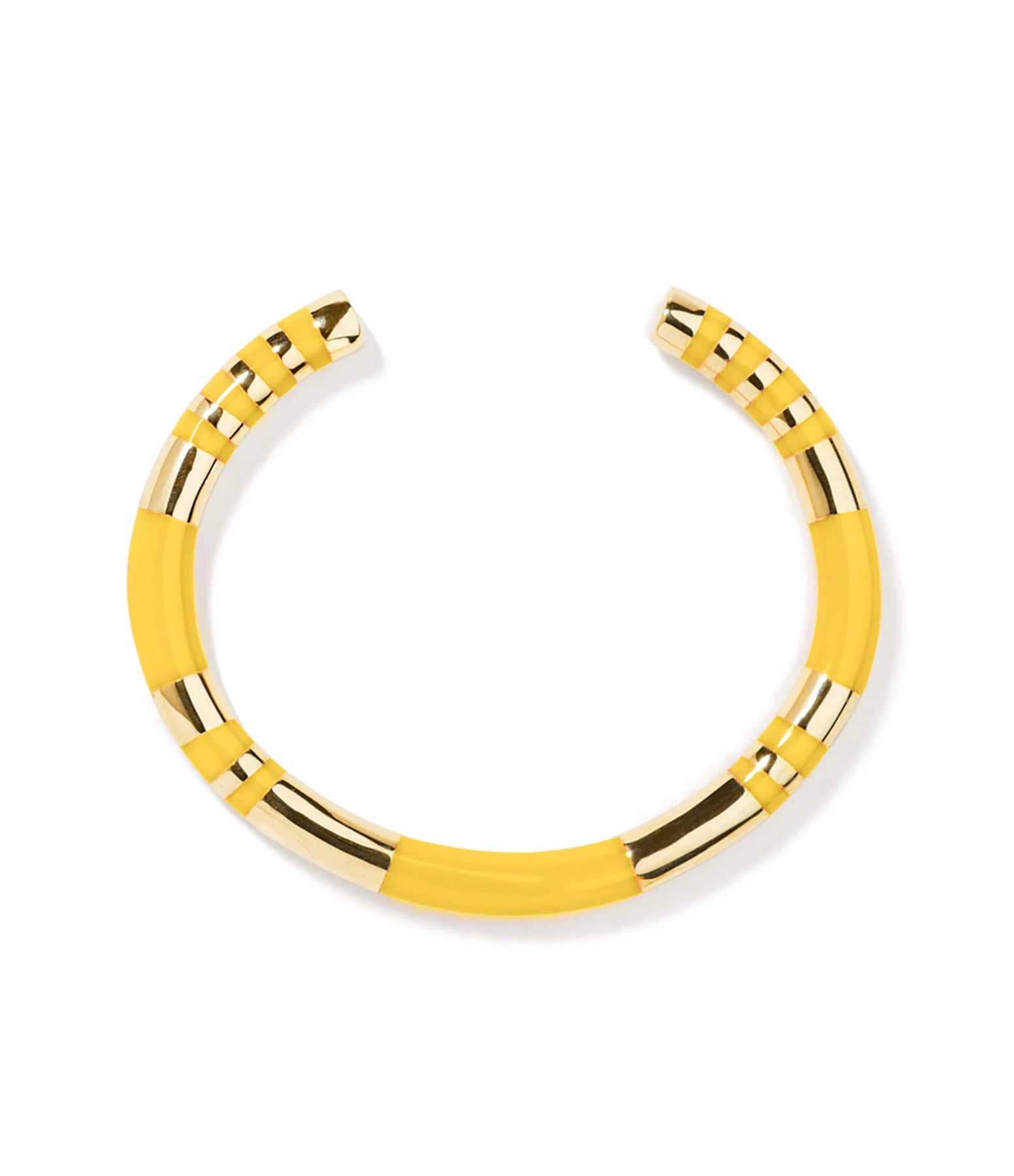 Bracelet jonc doré avec rayures en bakélite jaune. Jonc rigide, non réglable.