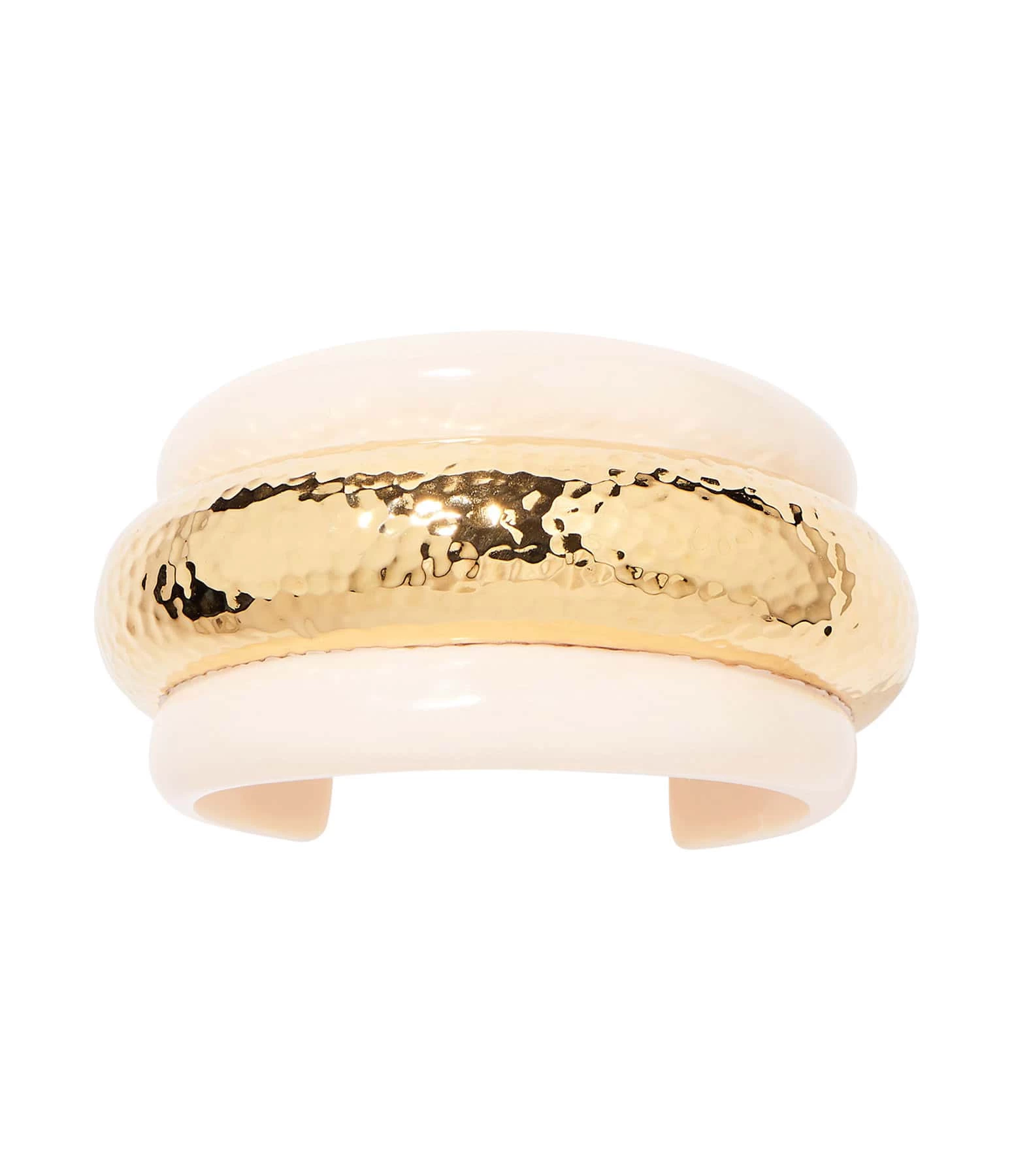Manchette en bakélite ivoire avec détails dorés martelés. Manchette rigide, non réglable.
