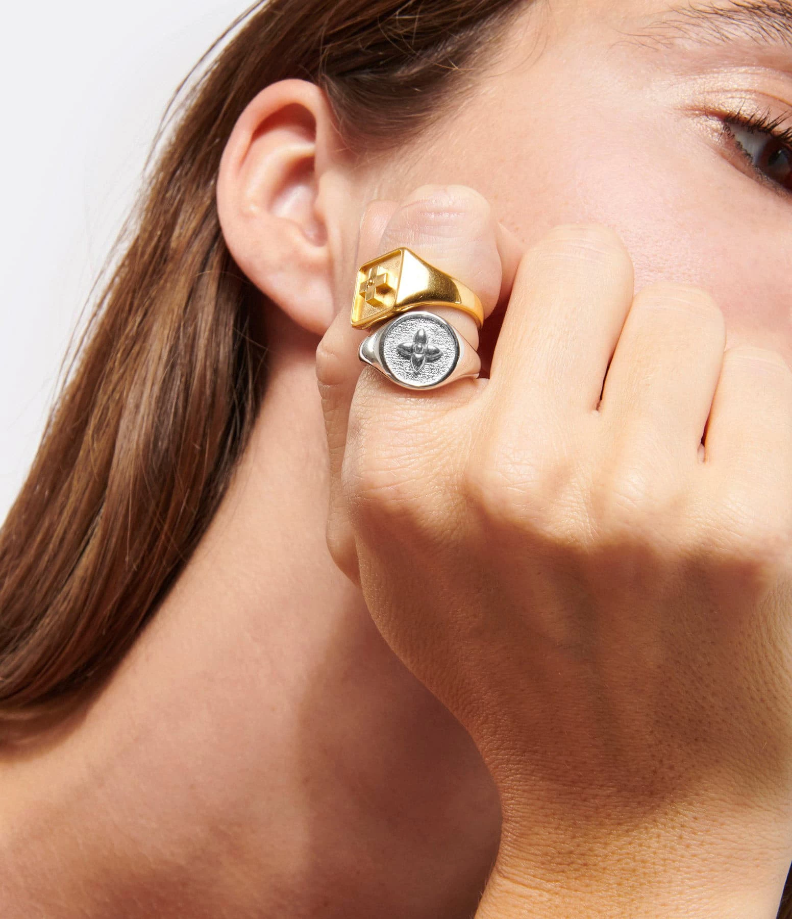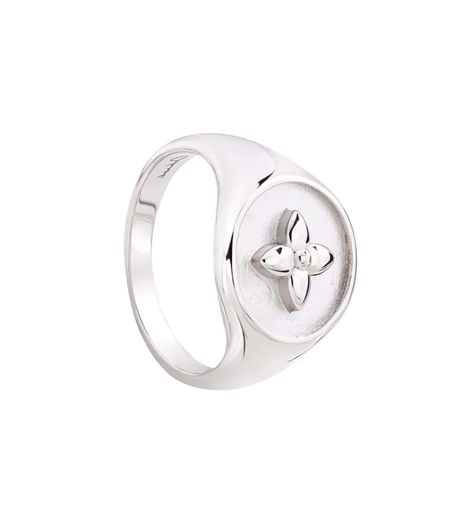 Chevalière ronde en argent avec symbole fleur « croisette de printemps ».