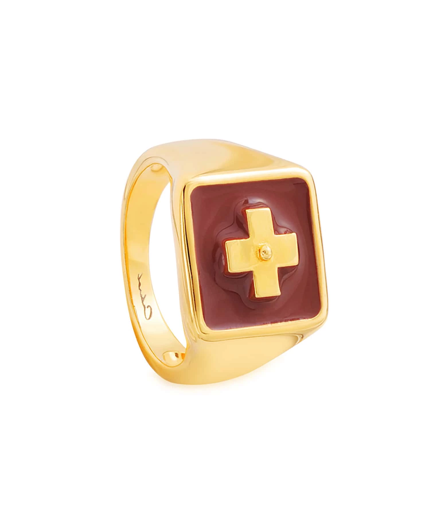 Chevalière carrée en vermeil et résine rouge foncé avec symbole « + ».
