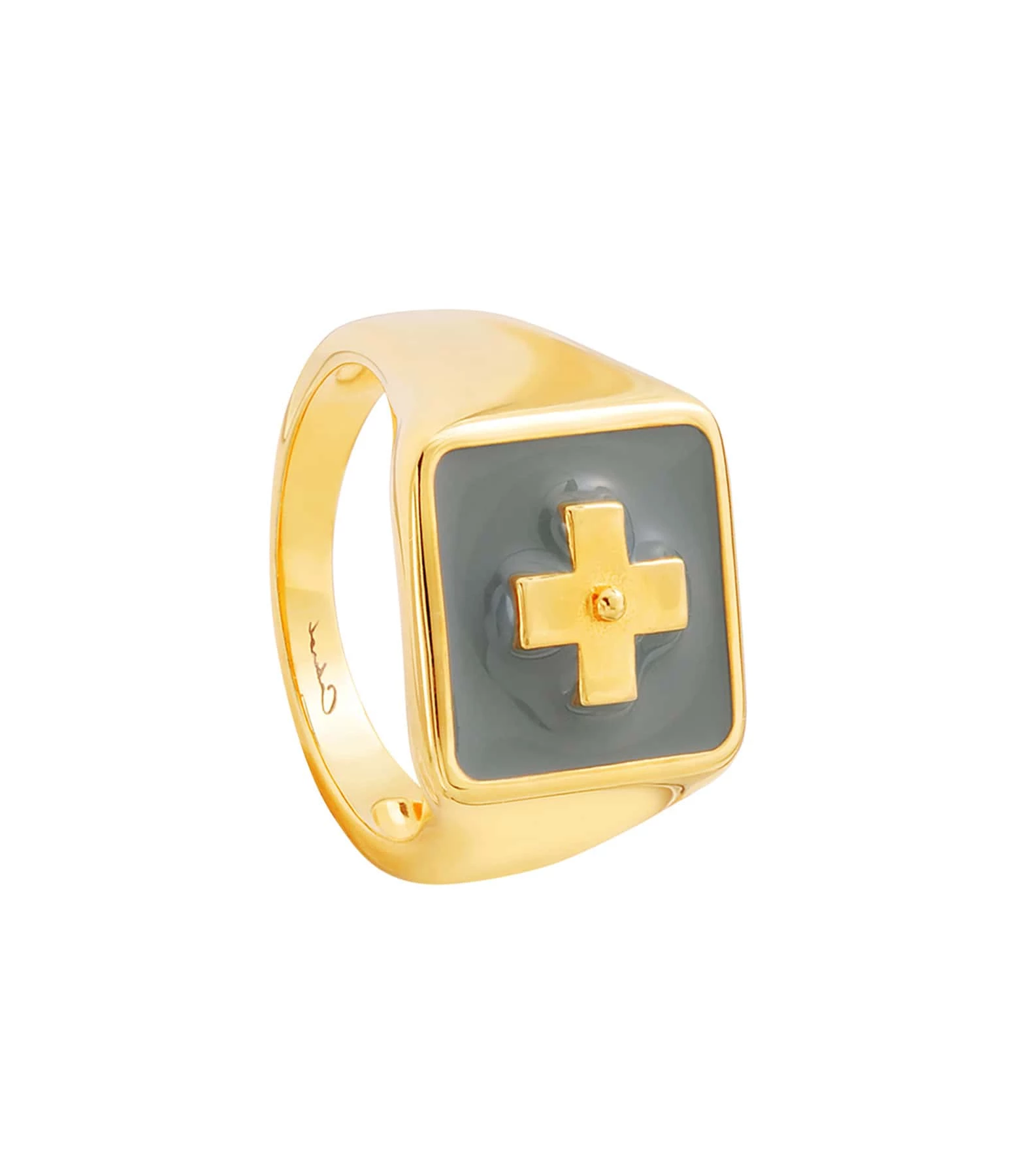 Chevalière carrée en vermeil et résine vert kaki avec symbole « + ».