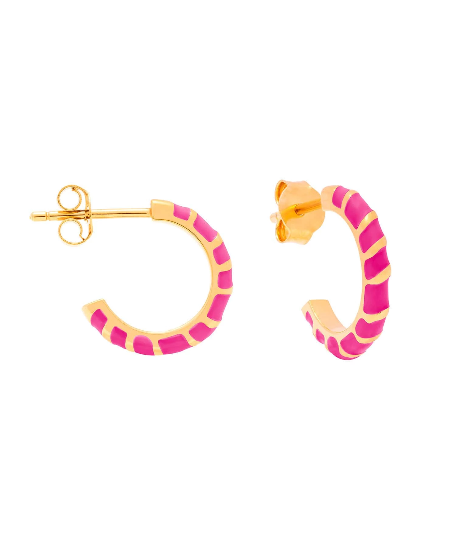 Créoles en vermeil entrelacé de laque rose fuchsia. Fermoir poussette. Vendues à la paire.