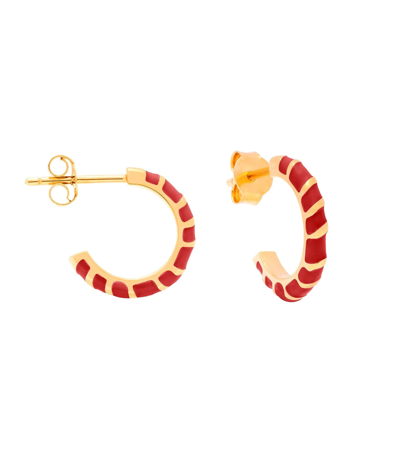 Créoles en vermeil entrelacé de laque rouge pourpre. Fermoir poussette. Vendues à la paire.