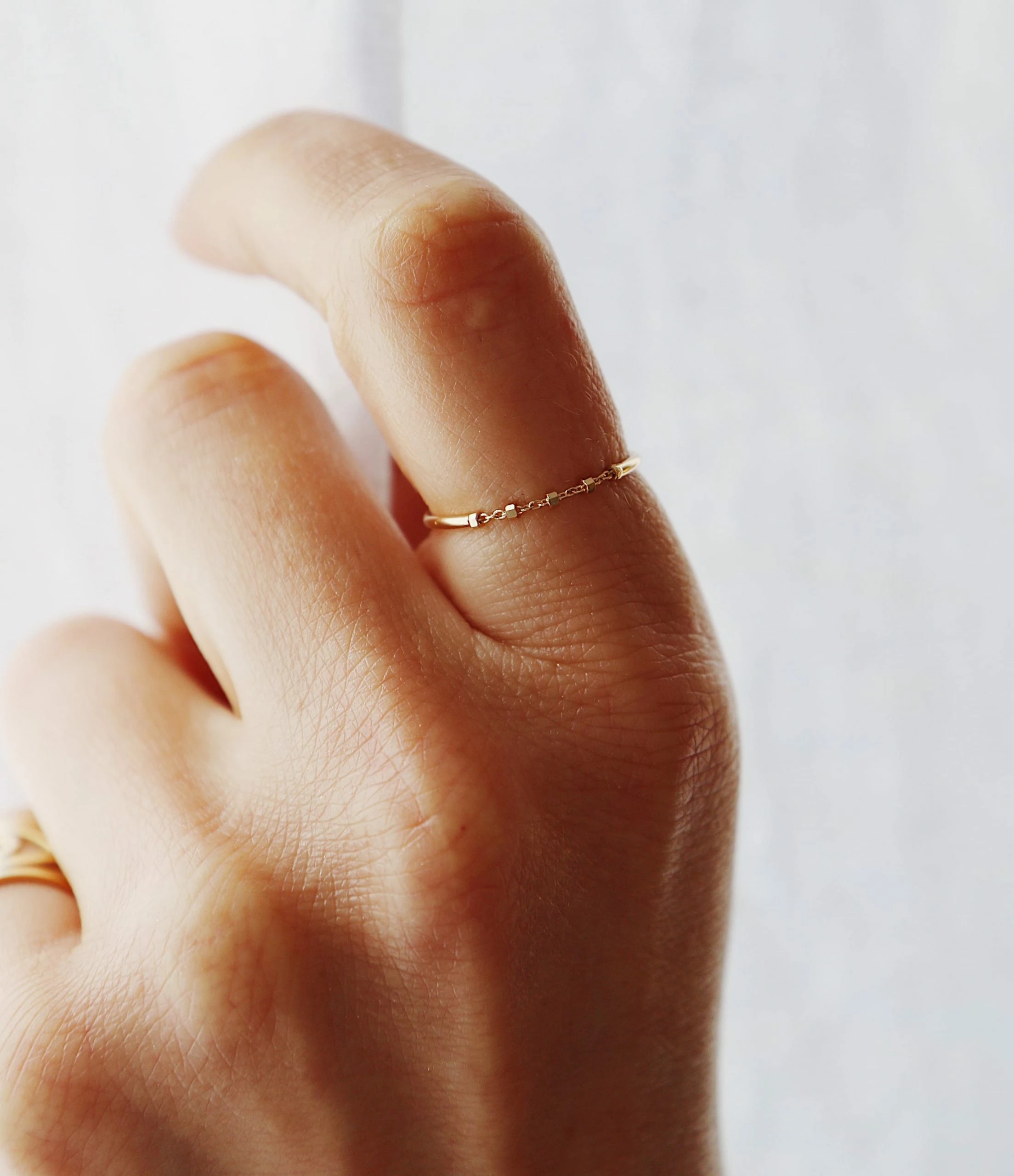 Bague en or jaune composée d’une chaîne souple en maille diamantée (ornée de petites perles facettées).