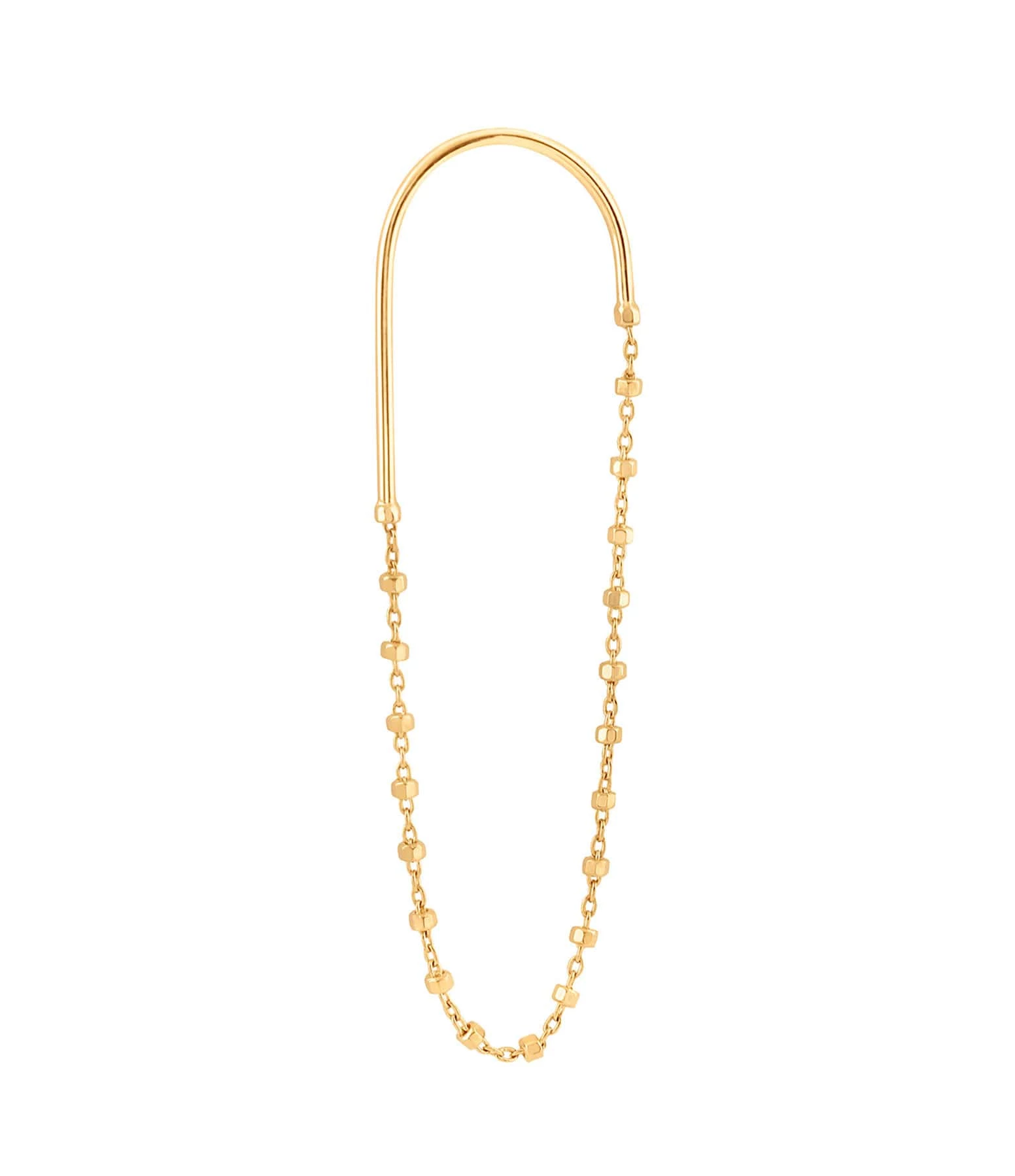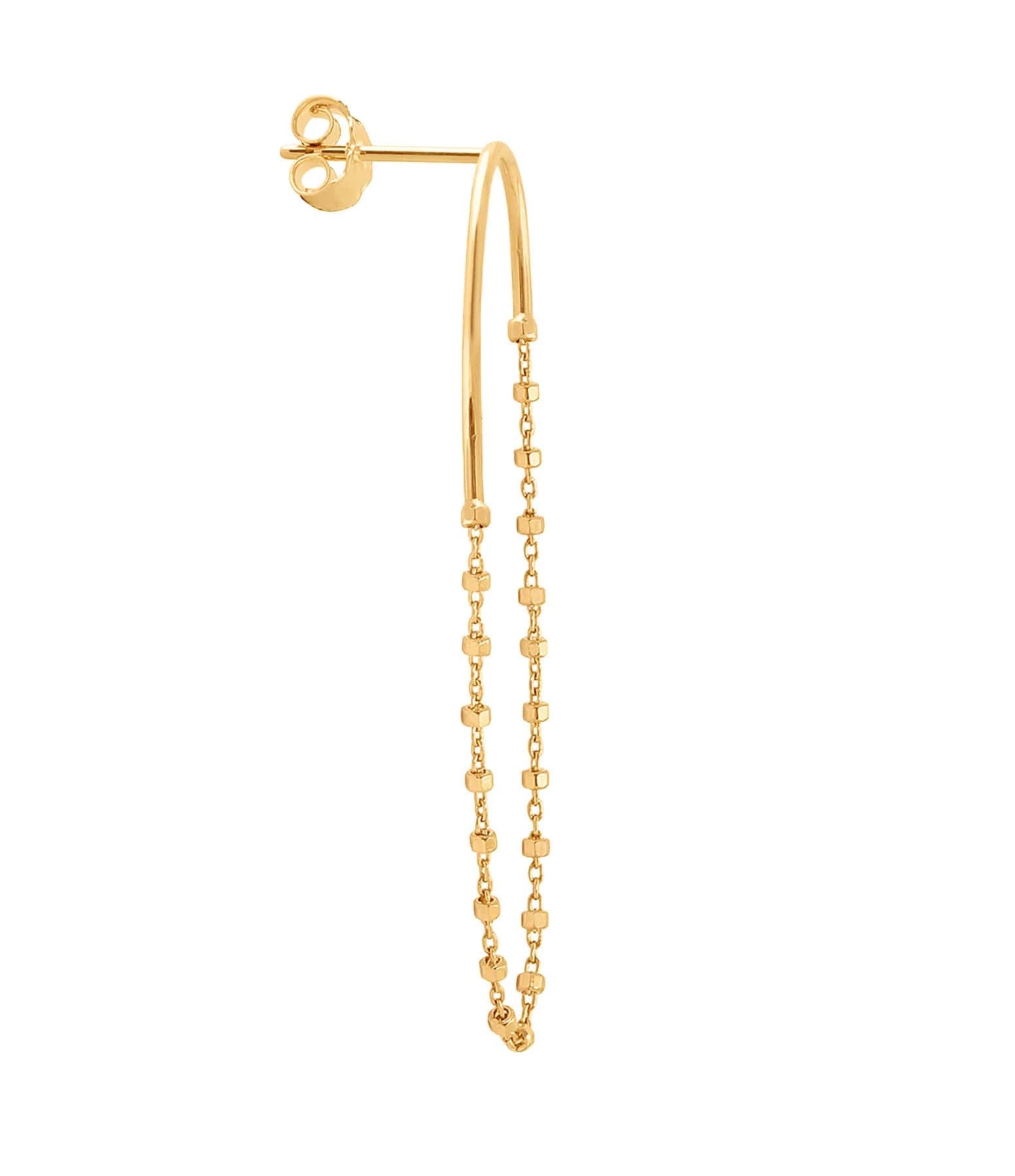 Boucle d’oreille en or jaune orné d’une chaîne en maille diamantée (ornée de petites perles facettées). Fermoir poussette.