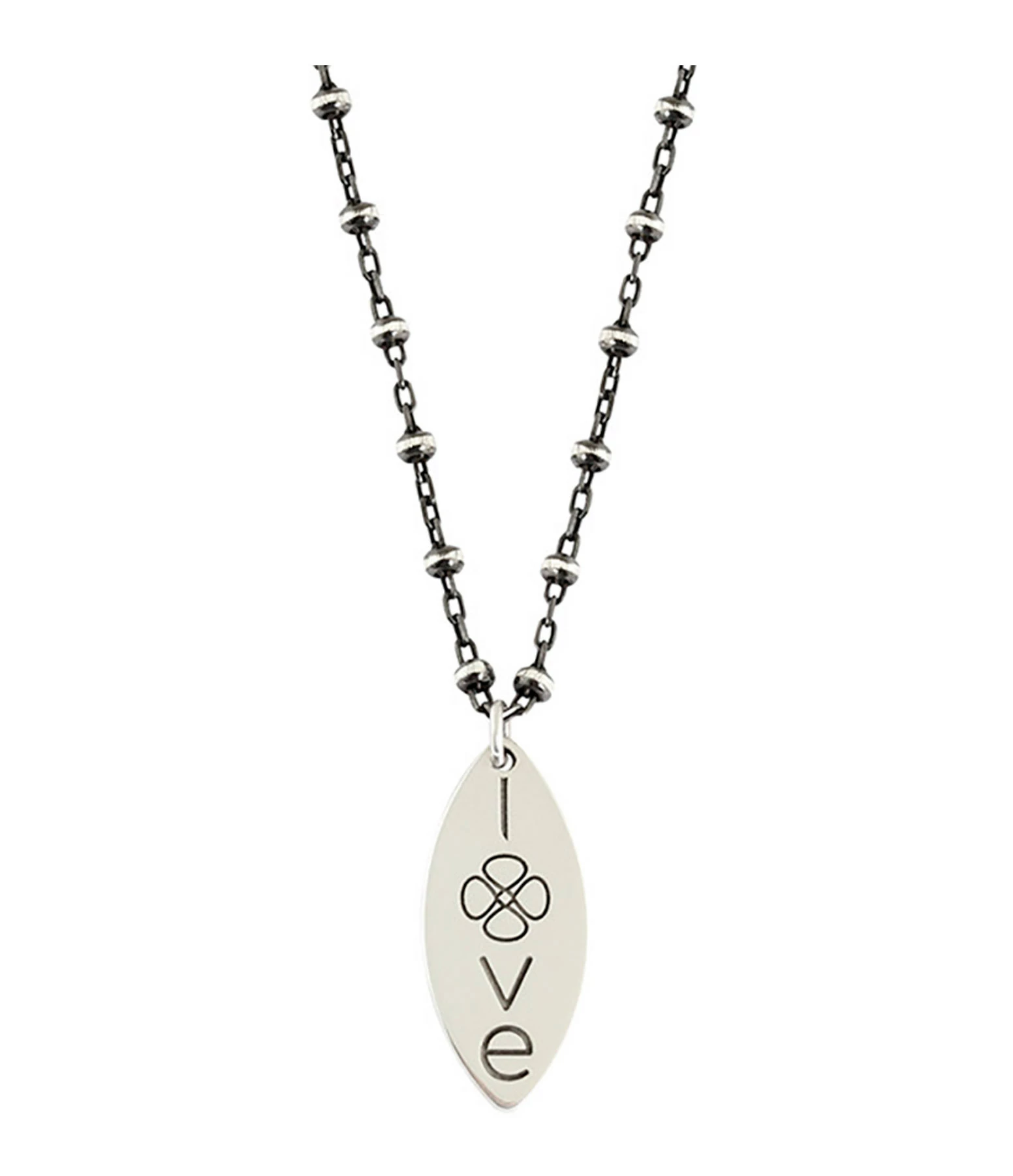 Collier en argent sur chaîne diamantée (petites perles facettées volontairement griffées), agrémenté d’un pendentif gravé « Love ».