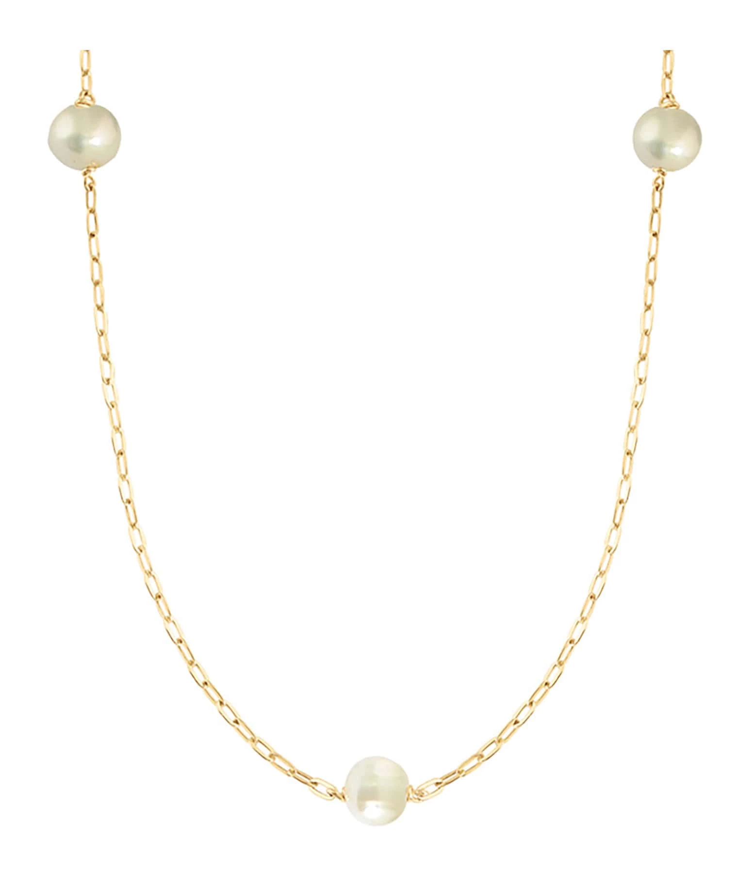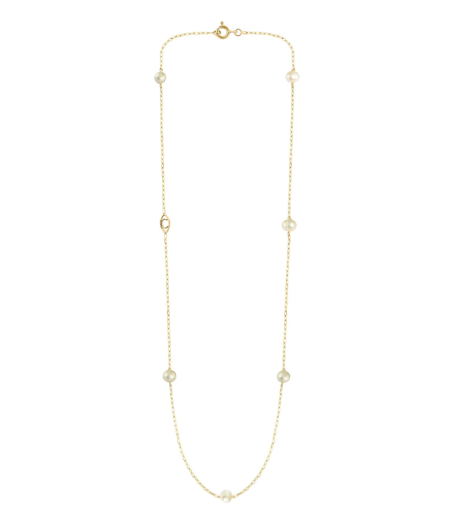 Collier en or jaune sur chaîne en maille forçat soulignée par six perles d’eau douce et d’un symbole Charlet. Fermoir à ressort.