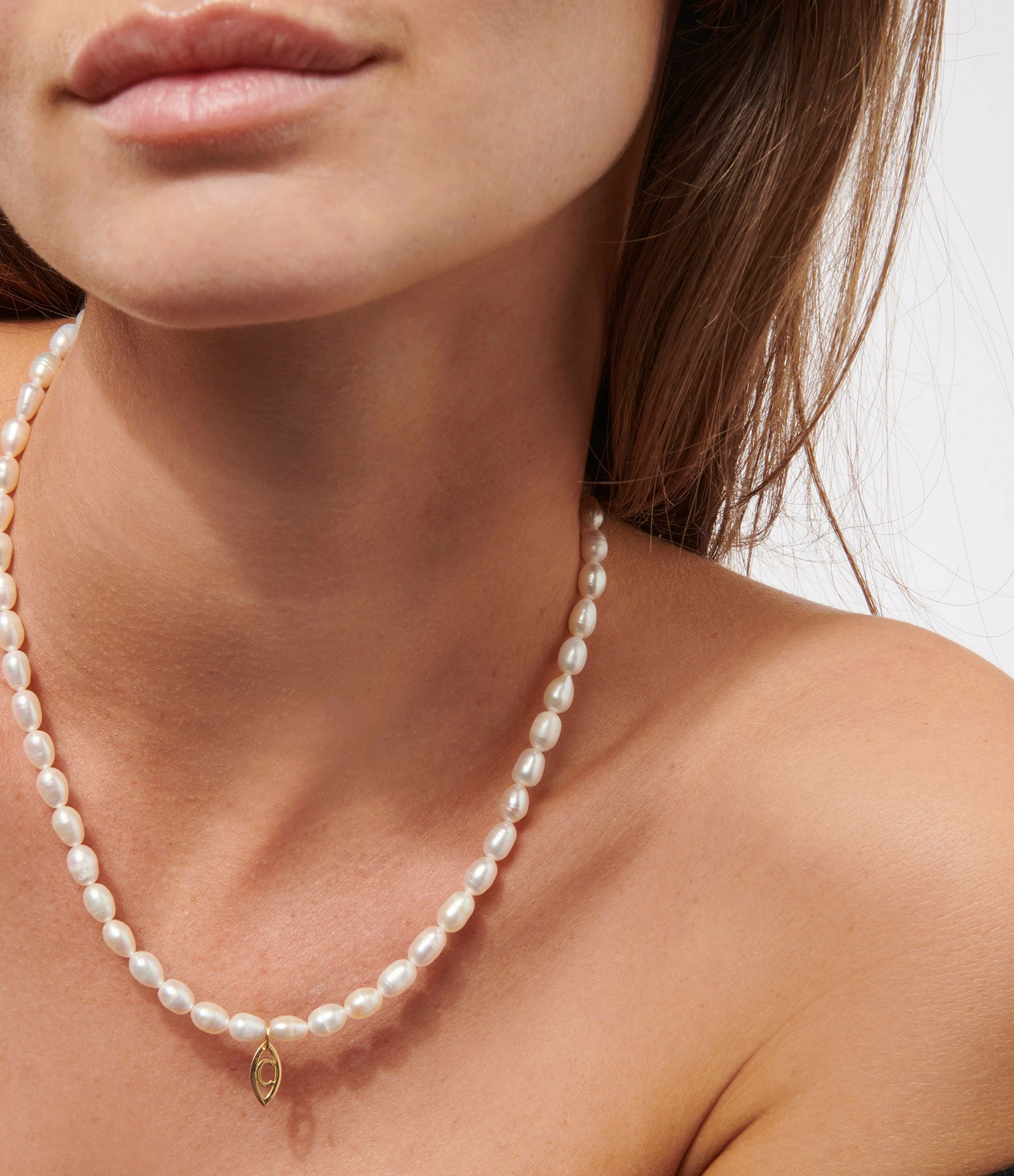 Collier de perles composé de perles d’eau douce et d’un pendentif Iris en or jaune représentant le symbole signature de Charlet.