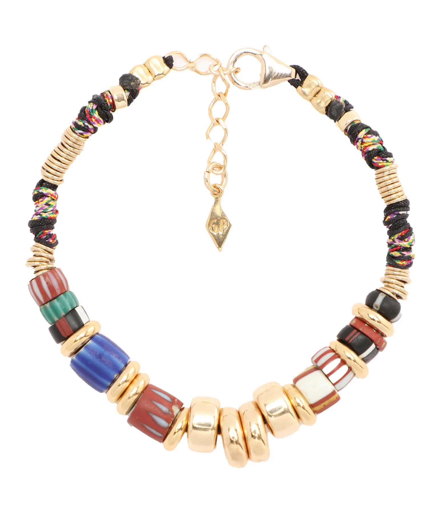 Bracelet serti de cordon tissé et de perles avec des finitions en laiton doré. Fermoir mousqueton avec chaînette de réglage.