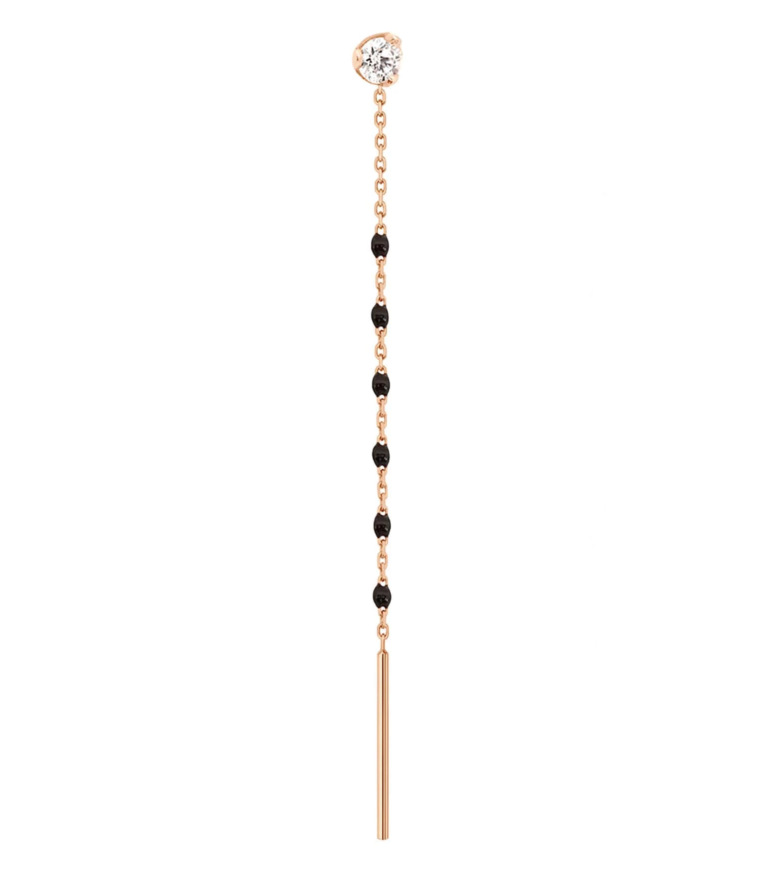 Boucle d’oreille sur chaîne en or rose, jaune ou gris agrémentée de mini perles de résine colorées et sertie d’un diamant blanc de 0,08 carat.Système sans fermoir : la tige et la chaînette sont glissées délicatement dans le trou de l’oreille.Vendue à l’unité.