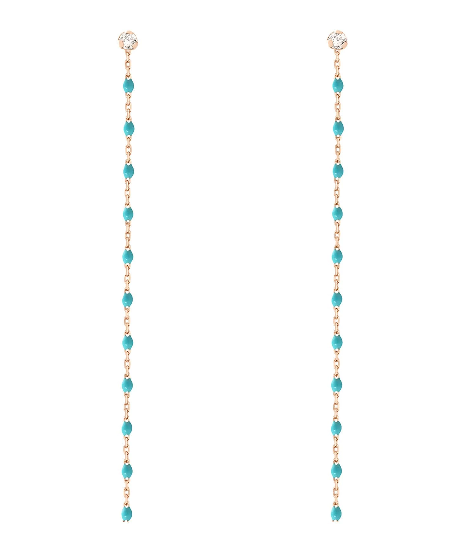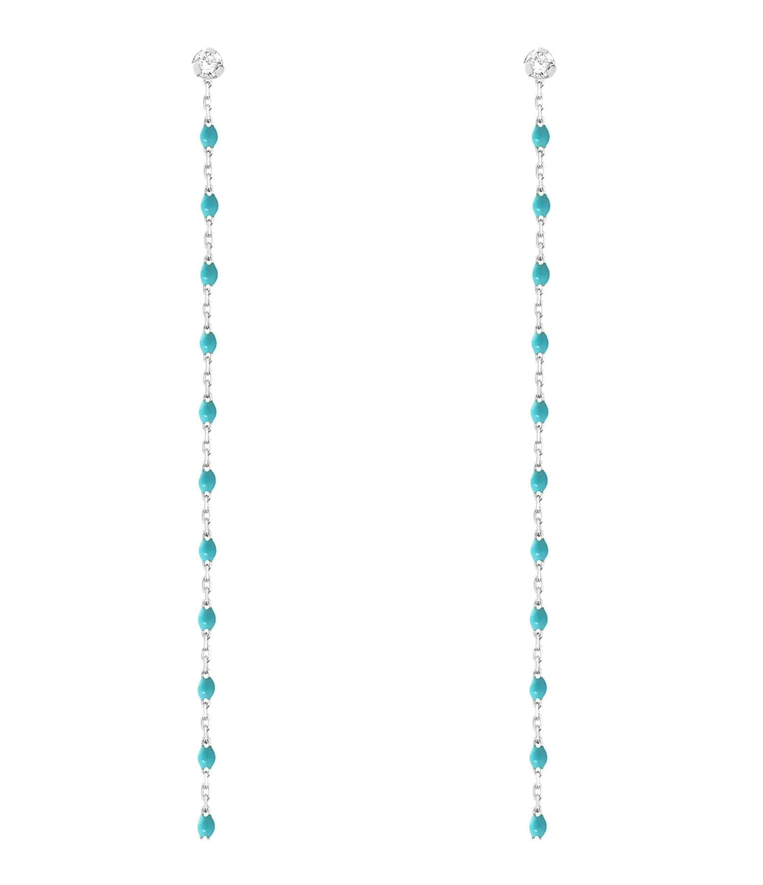 Boucles d’oreilles pendantes en or, ornées de mini perles résine et d’un diamant. Fermoir poussette.