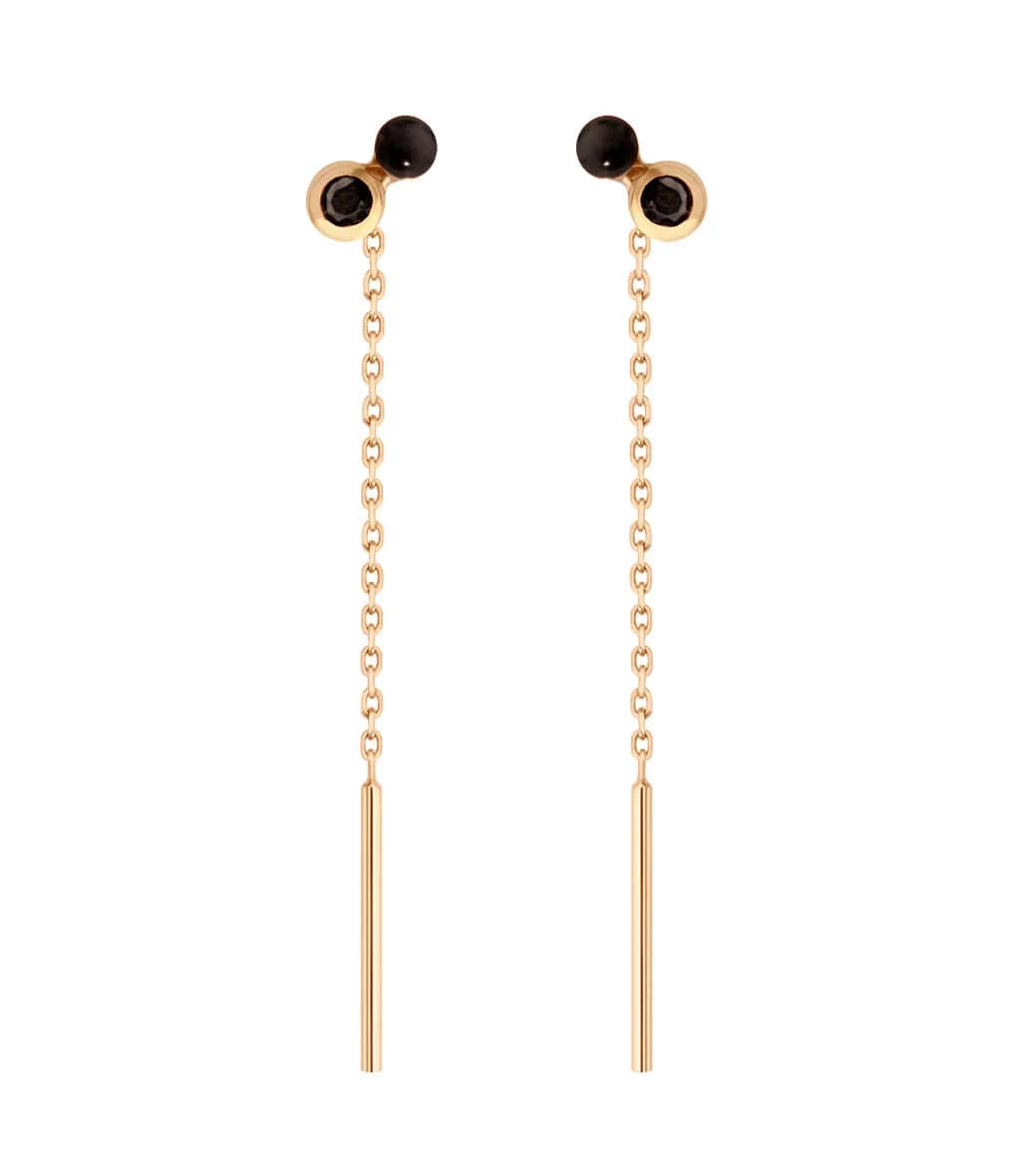 Boucles d’oreilles pendantes en or rose, jaune ou gris agrémentées de pierres et de résine de couleur correspondante. Système sans fermoir : la tige et la chaînette sont glissées délicatement dans le trou de l’oreille.Vendues à la paire.