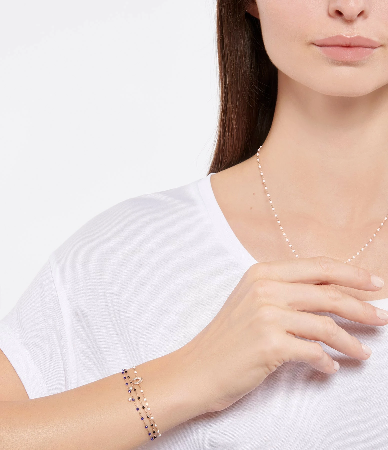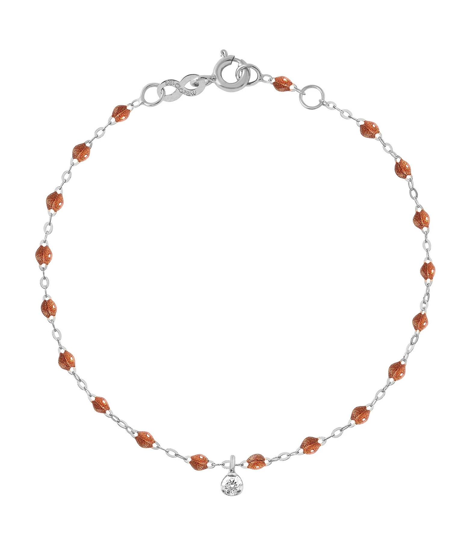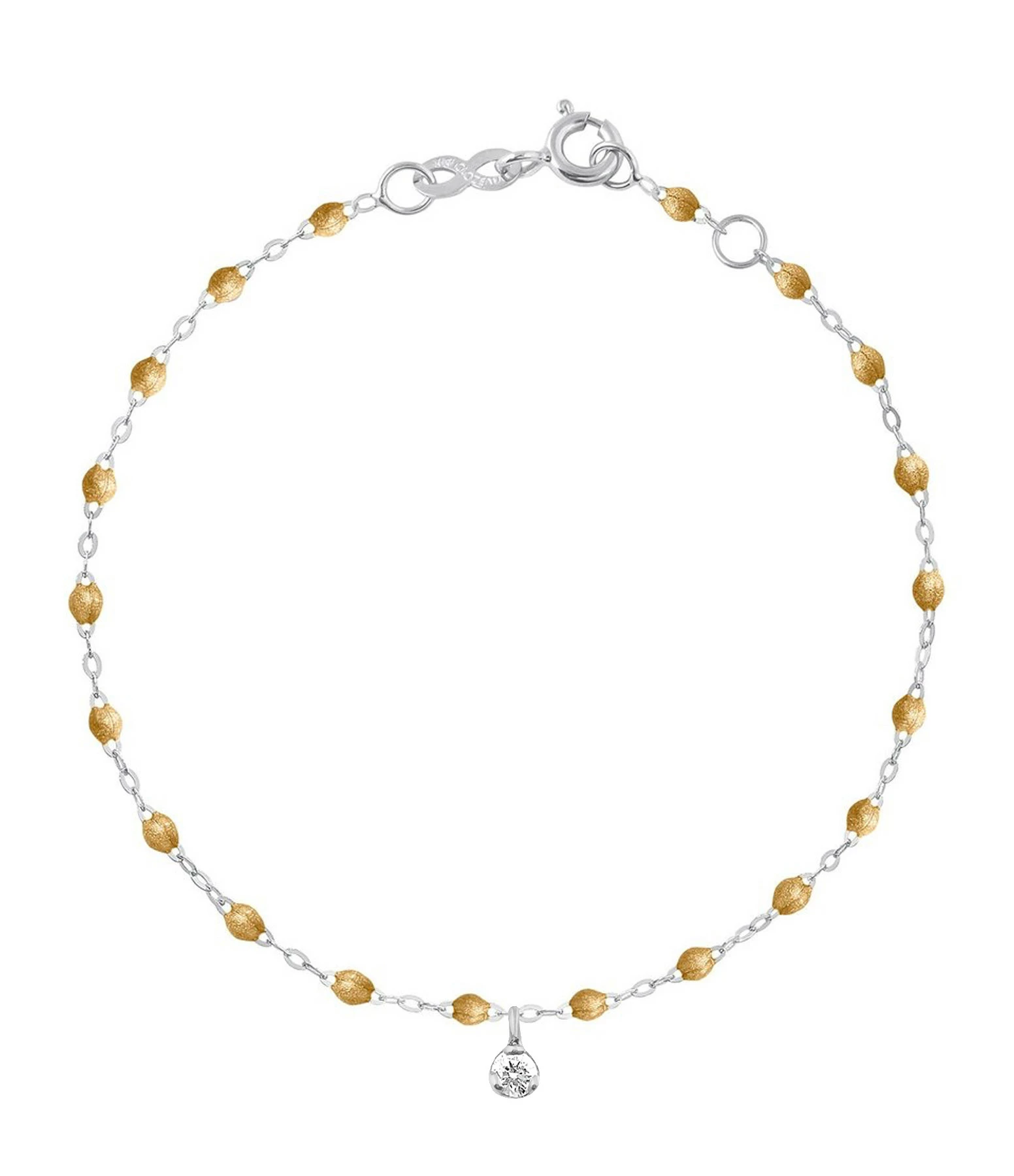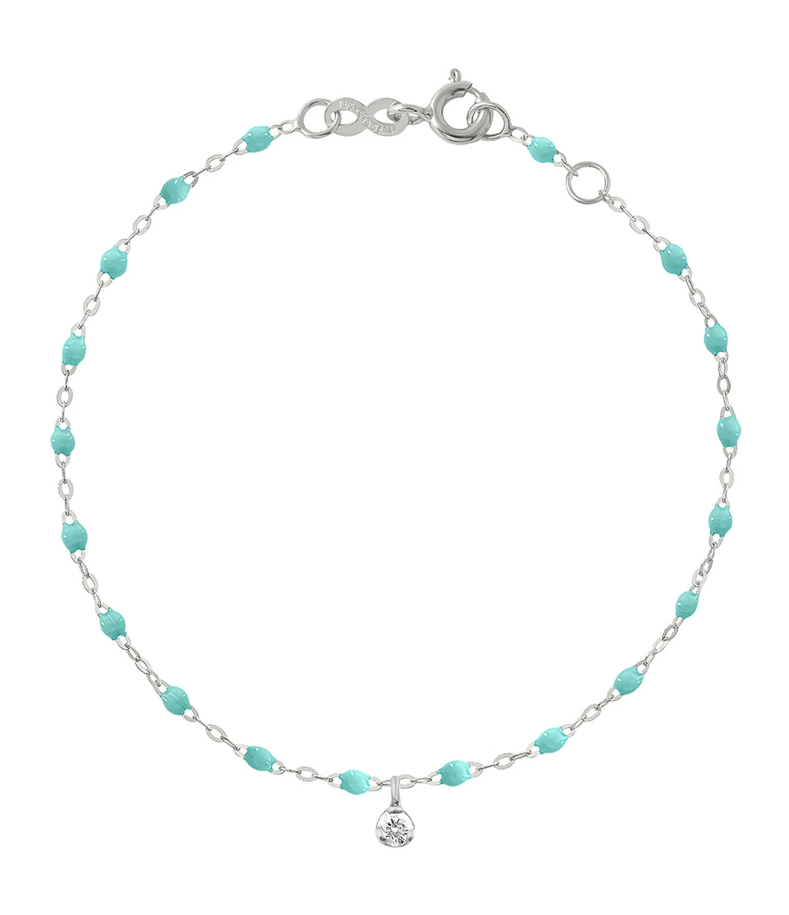 Bracelet sur chaîne en or gris agrémenté de perles de résine et d’un diamant en pendentif. Fermoir classique à ressort avec contre-anneau.