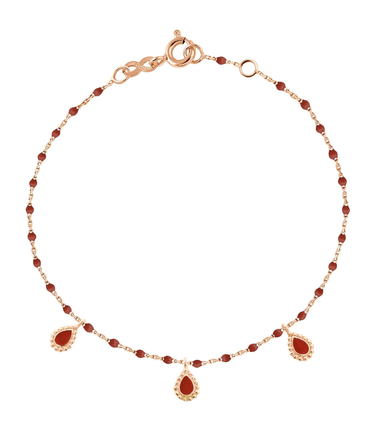 Bracelet sur chaîne en or rose, agrémenté de trois pendentifs et de mini perles de résine. Fermoir classique à ressort avec contre-anneau.