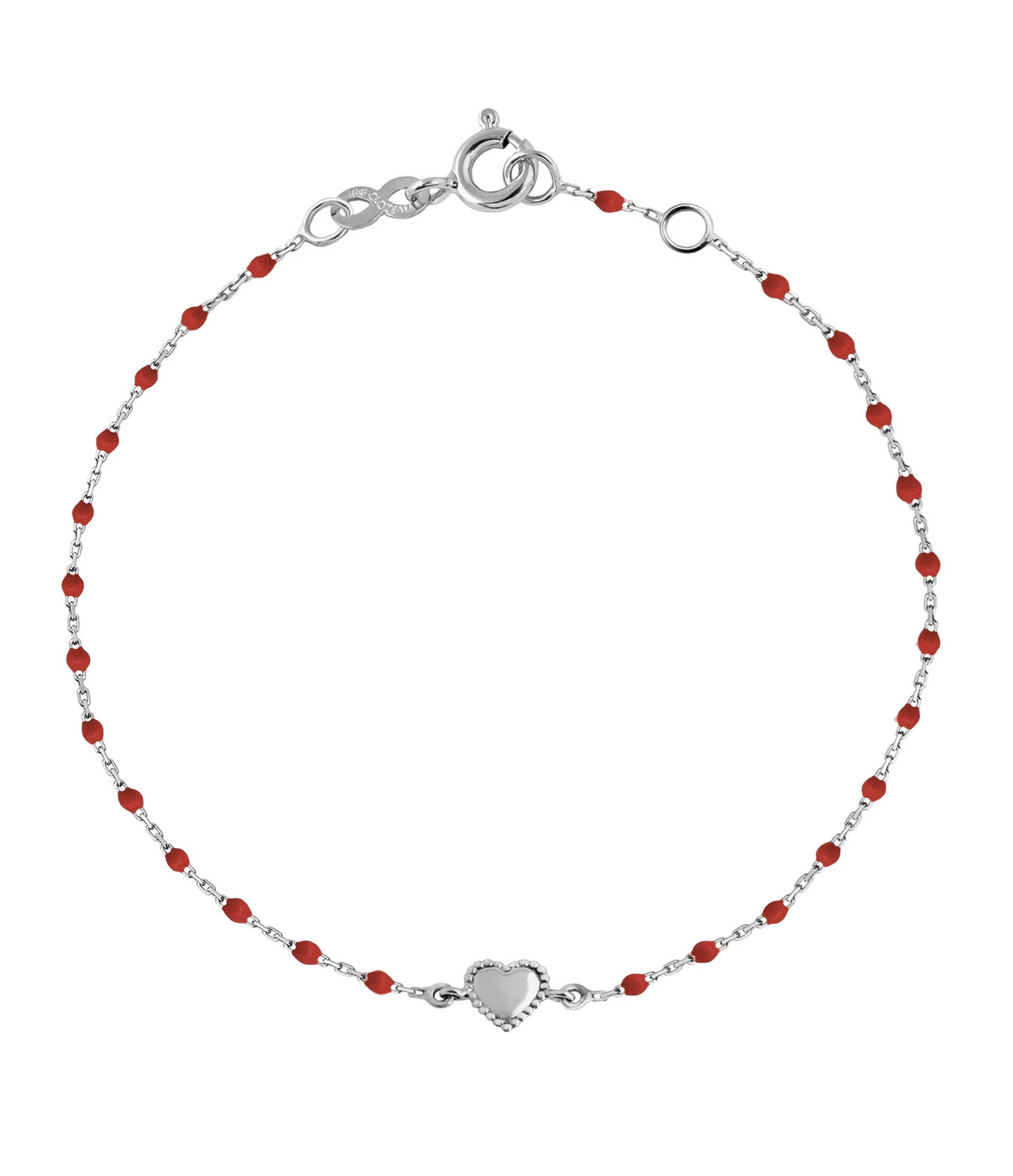Bracelet sur chaîne en or gris agrémenté de mini perles de résine et d’un petit cœur. Fermoir classique à ressort avec contre-anneau.