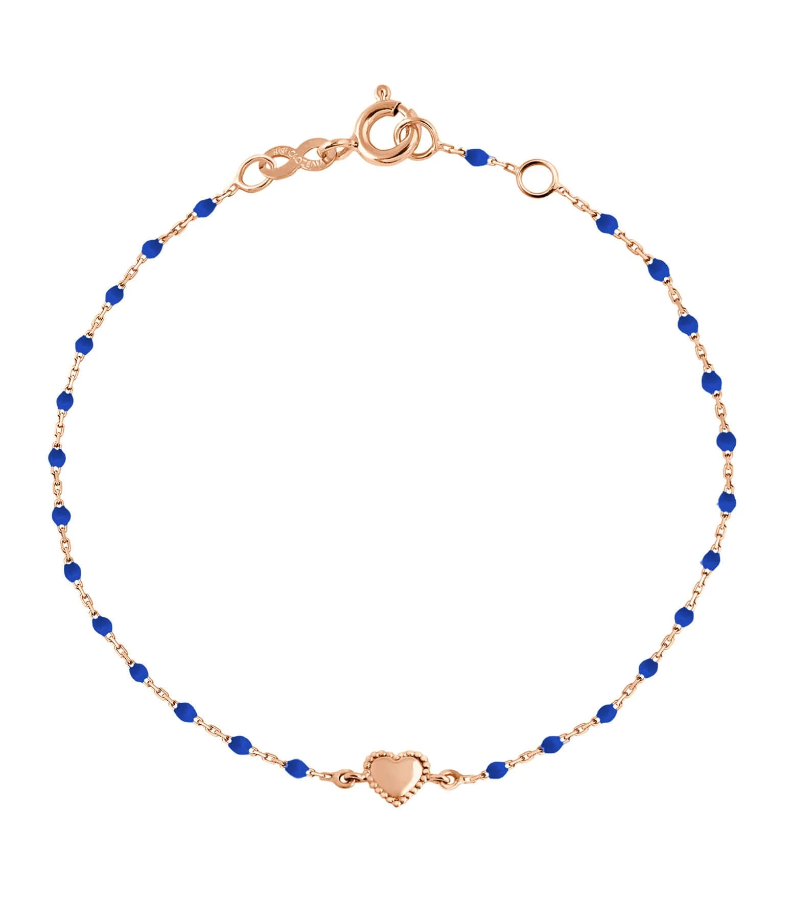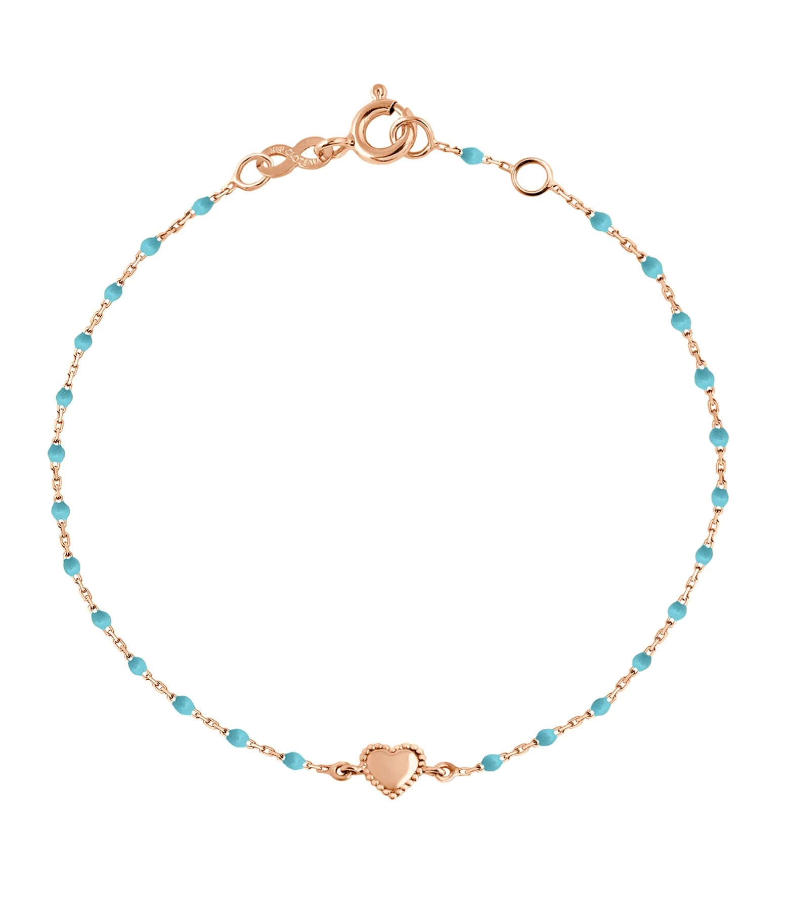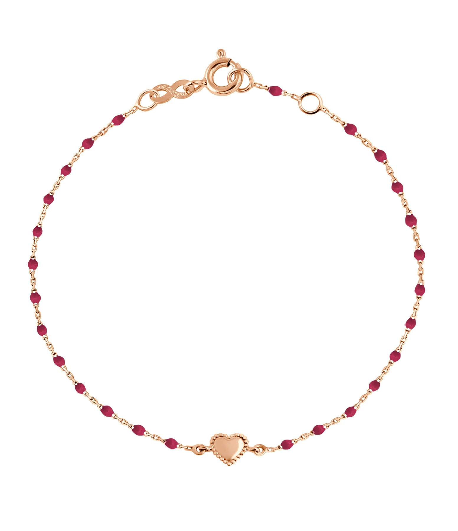 Bracelet sur chaîne en or rose agrémenté de mini perles de résine et d’un petit cœur. Fermoir classique à ressort avec contre-anneau.