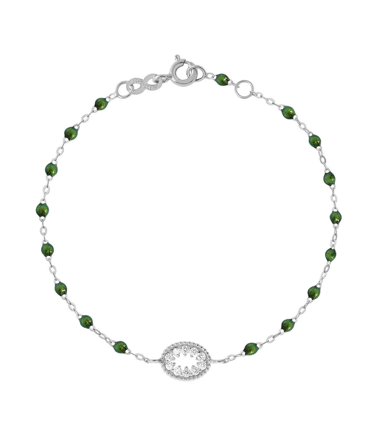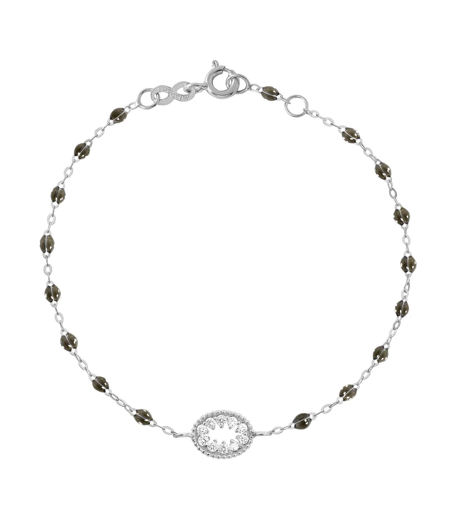 Bracelet sur chaîne en or blanc agrémenté de perles de résine et d’un pendentif en forme d’œil. Fermoir classique à ressort avec contre-anneau.