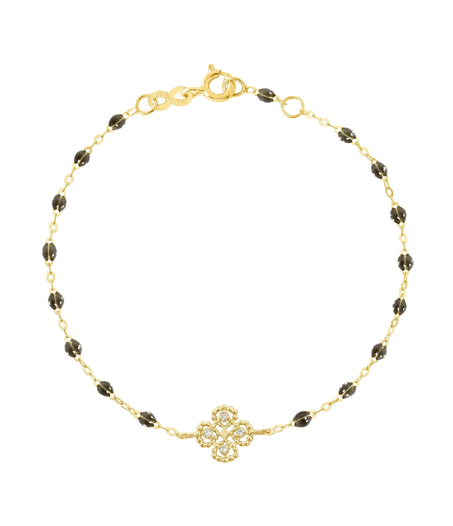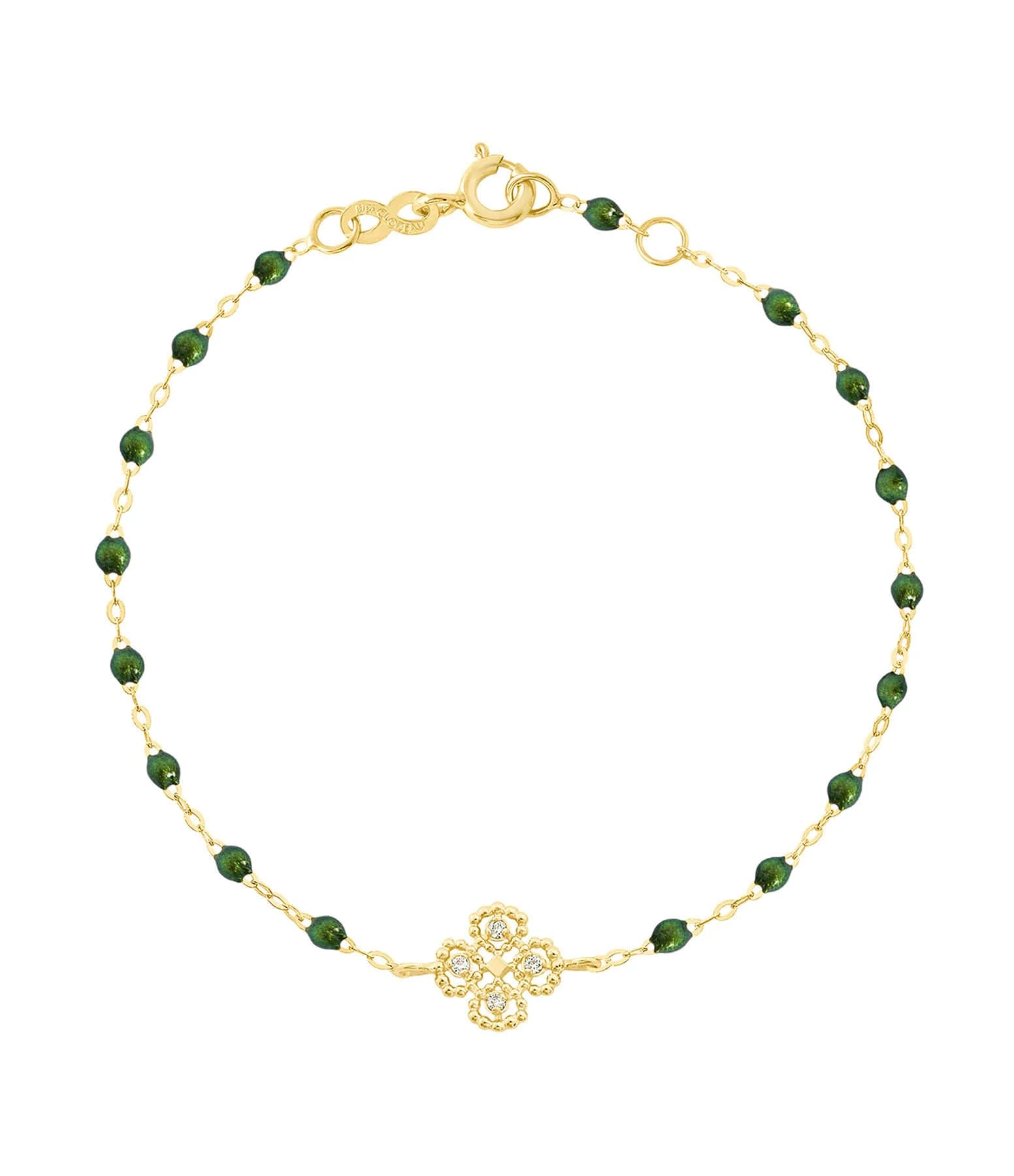 Bracelet sur chaîne en or jaune agrémenté de perles de résine et d’un pendentif en forme de trèfle. Fermoir classique à ressort avec contre-anneau.