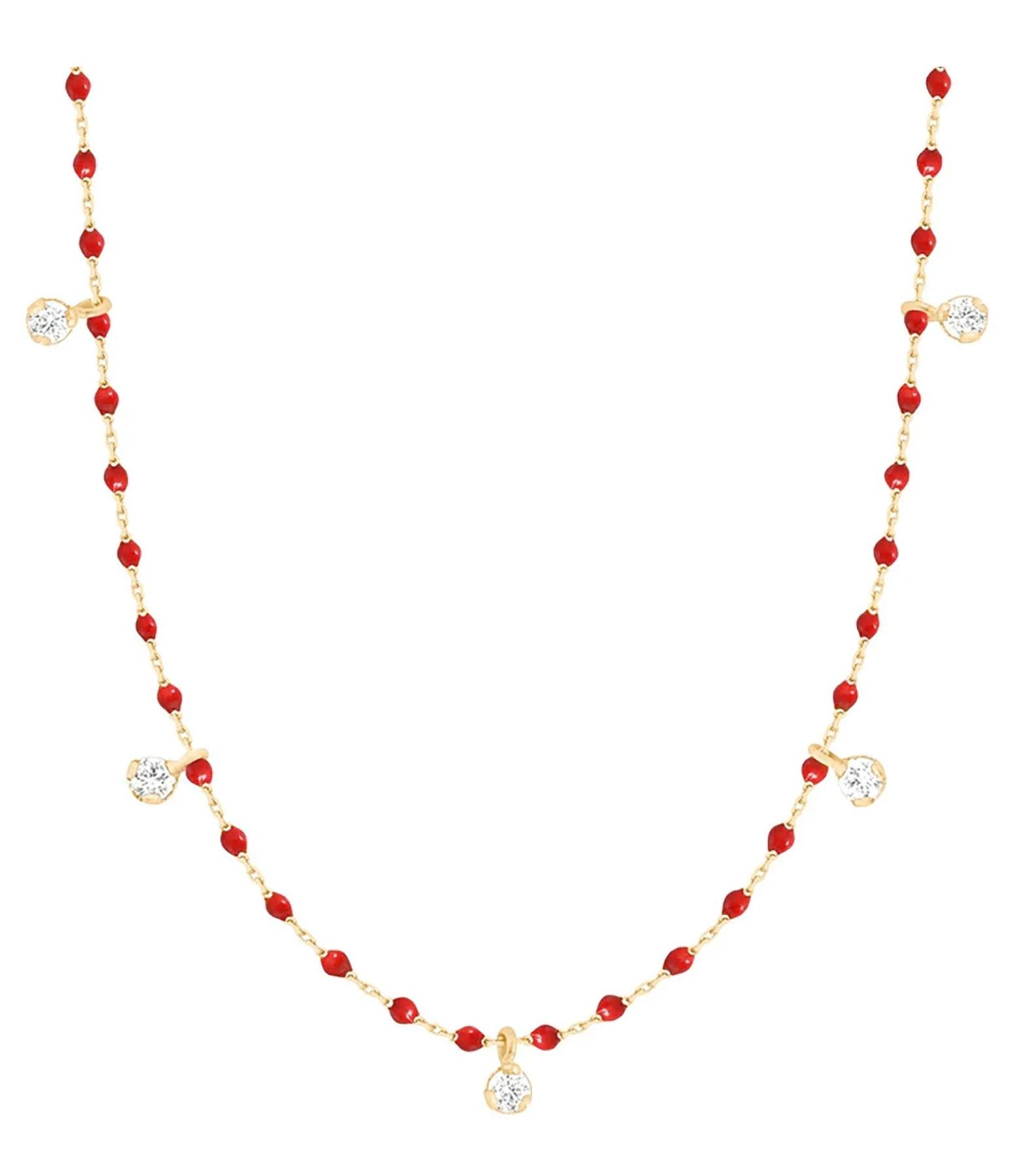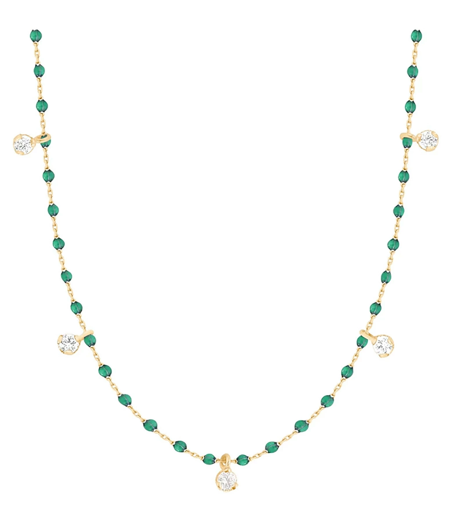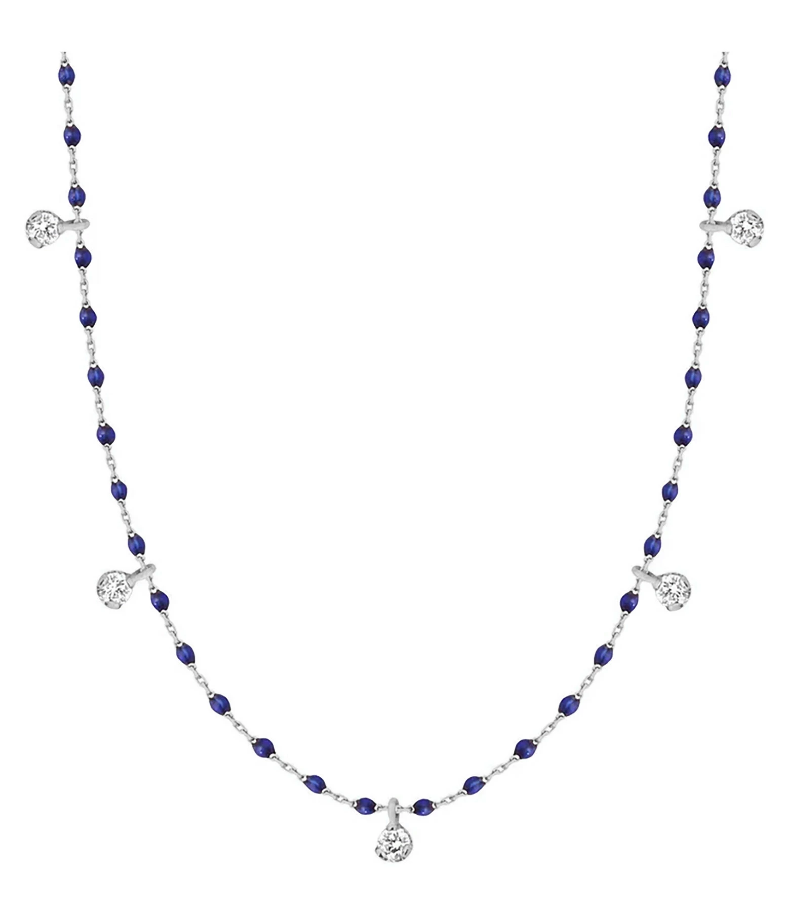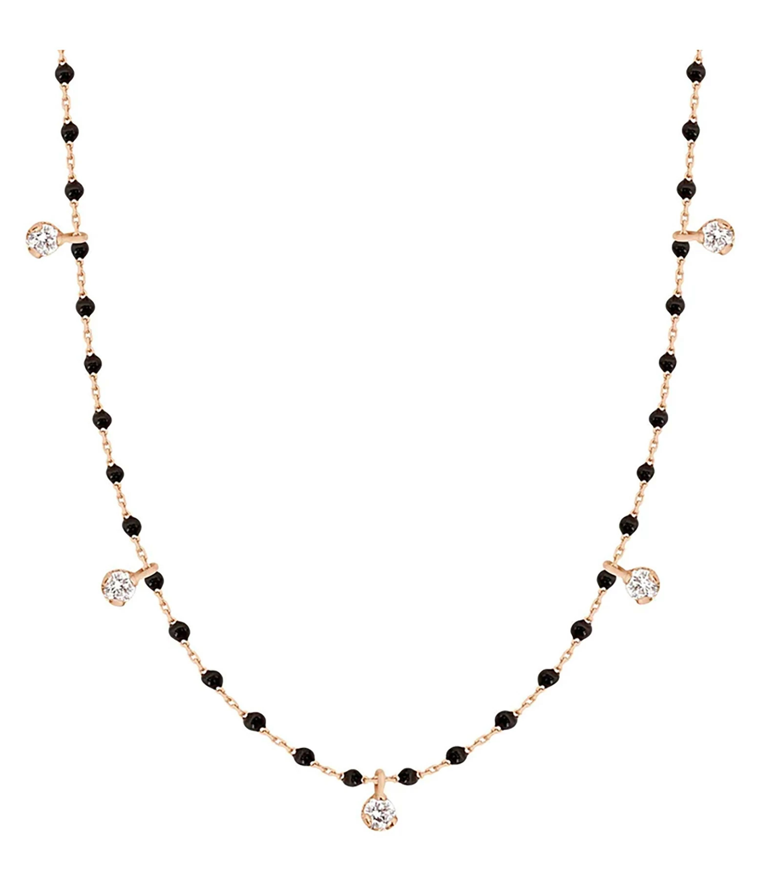 Collier sur chaîne en or rose, jaune ou gris agrémenté de cinq diamants blancs et de mini perles de résine. Fermoir classique à ressort avec contre-anneau.