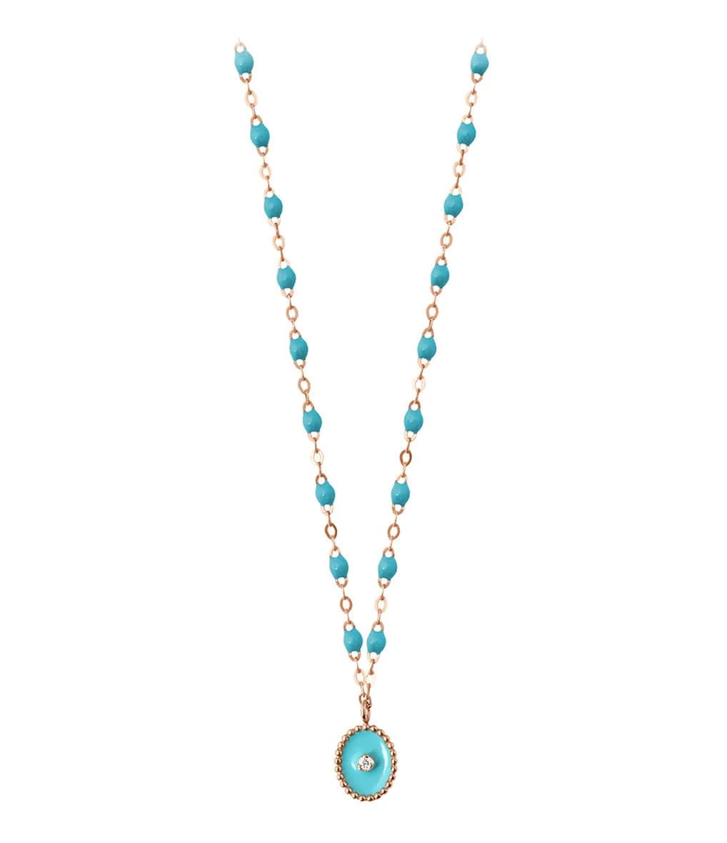 Collier sur chaîne en or gris, jaune ou rose avec perles de résine, agrémenté d’un pendentif Étoile du Nord serti d’un diamant blanc et de résine (identique au coloris des perles). Fermoir classique à ressort avec contre-anneau.