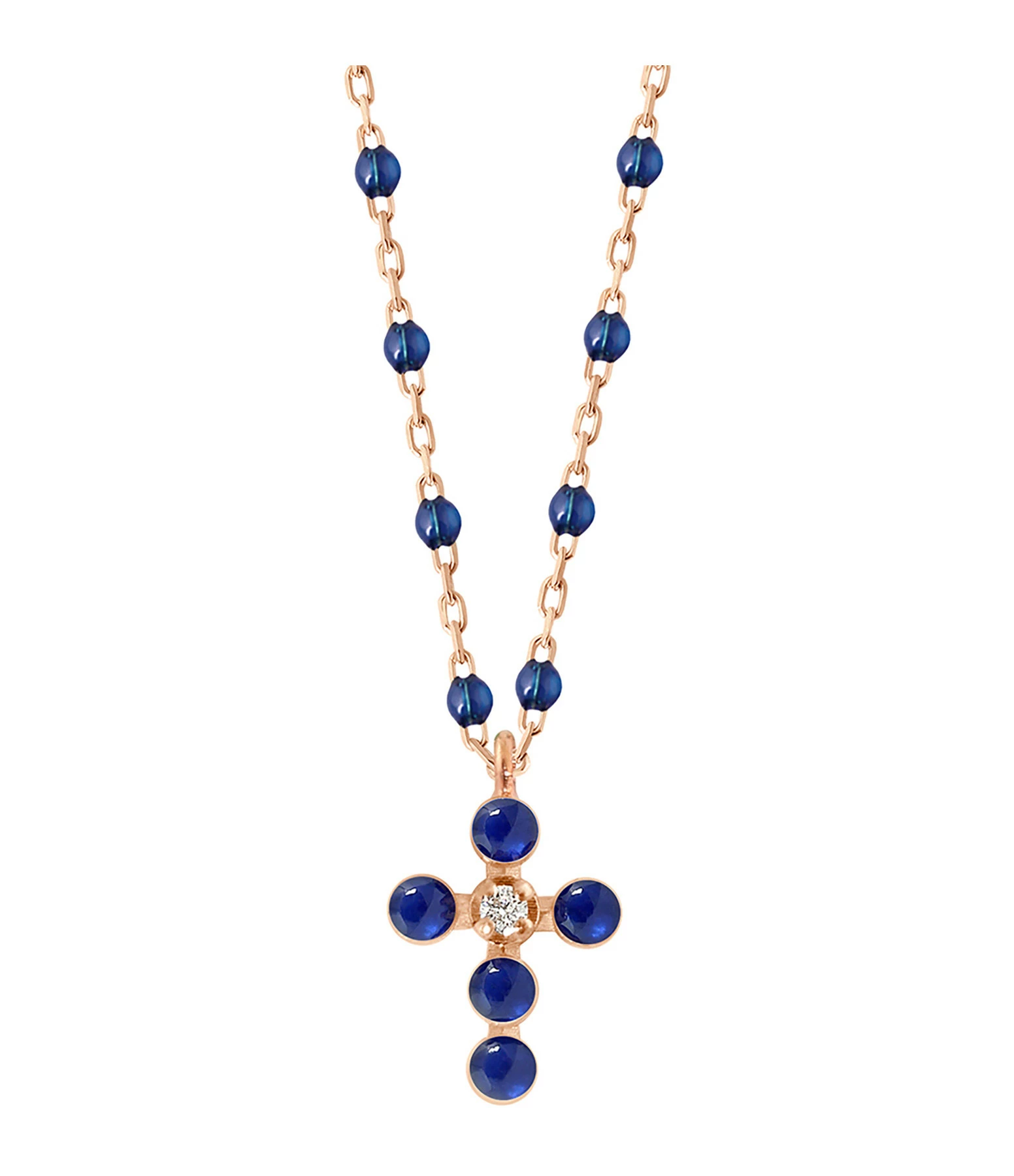 Collier sur chaîne en or rose agrémenté de perles de résine et d’un pendentif croix serti d’un diamant. Fermoir classique à ressort avec contre-anneau.