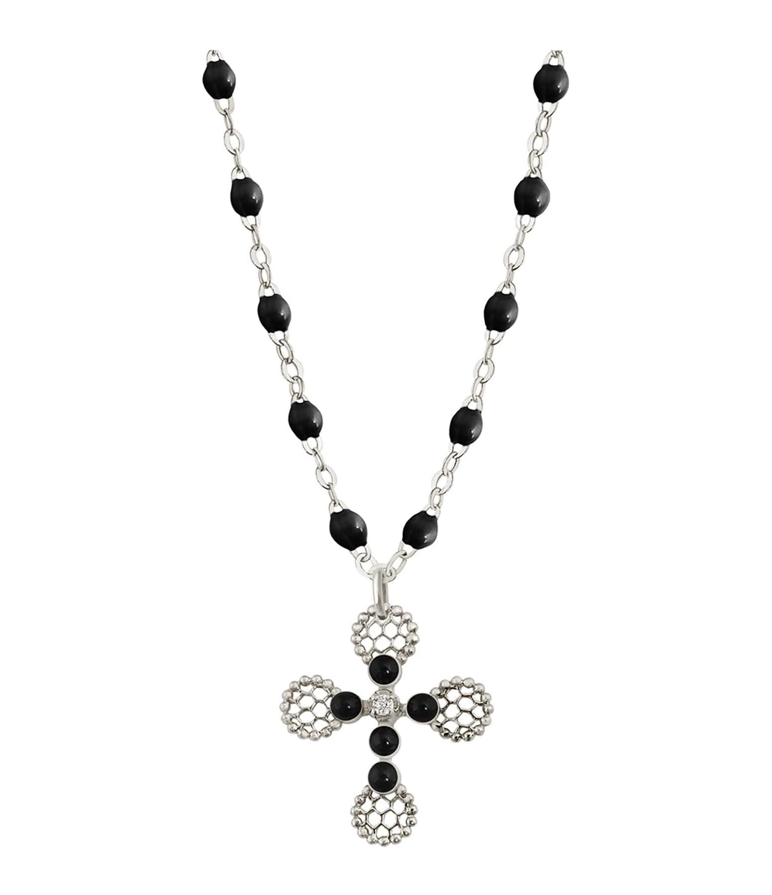 Collier sur chaîne en or blanc agrémenté de perles de résine et d’un pendentif croix serti d’un diamant. Fermoir classique à ressort avec contre-anneau.