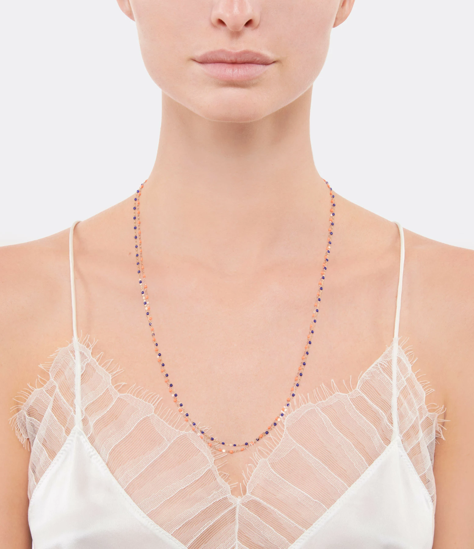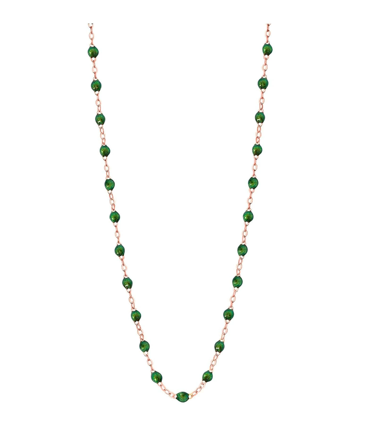 Collier sur chaîne en or gris, jaune ou rose agrémenté de perles de résine. Fermoir classique à ressort avec contre-anneau.
