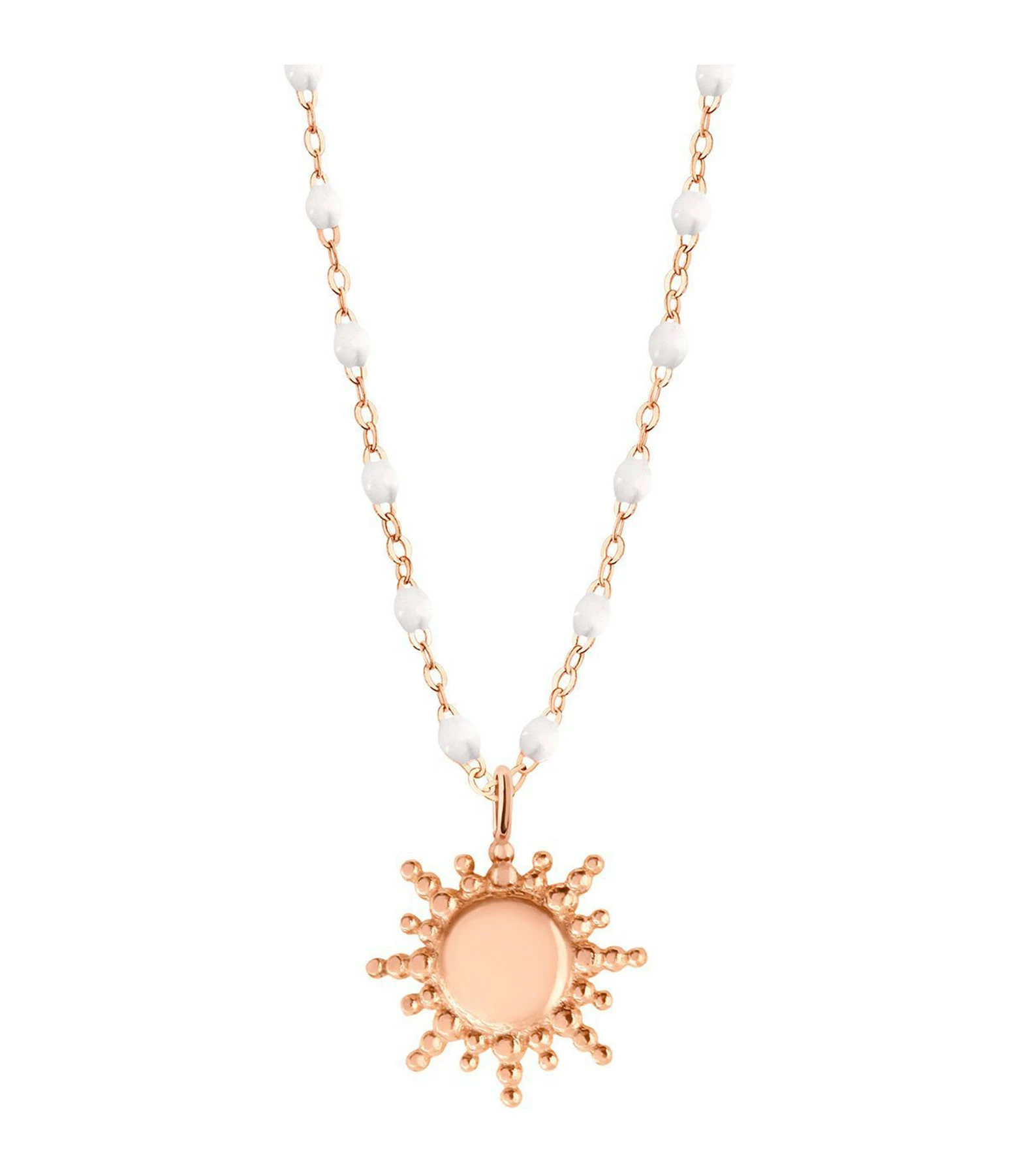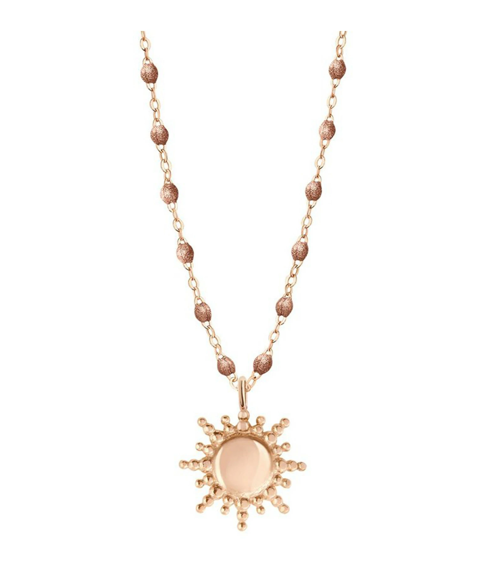 Collier sur chaîne en or rose, agrémenté d’un pendentif soleil et de perles de résine. Fermoir classique à ressort avec contre-anneau.