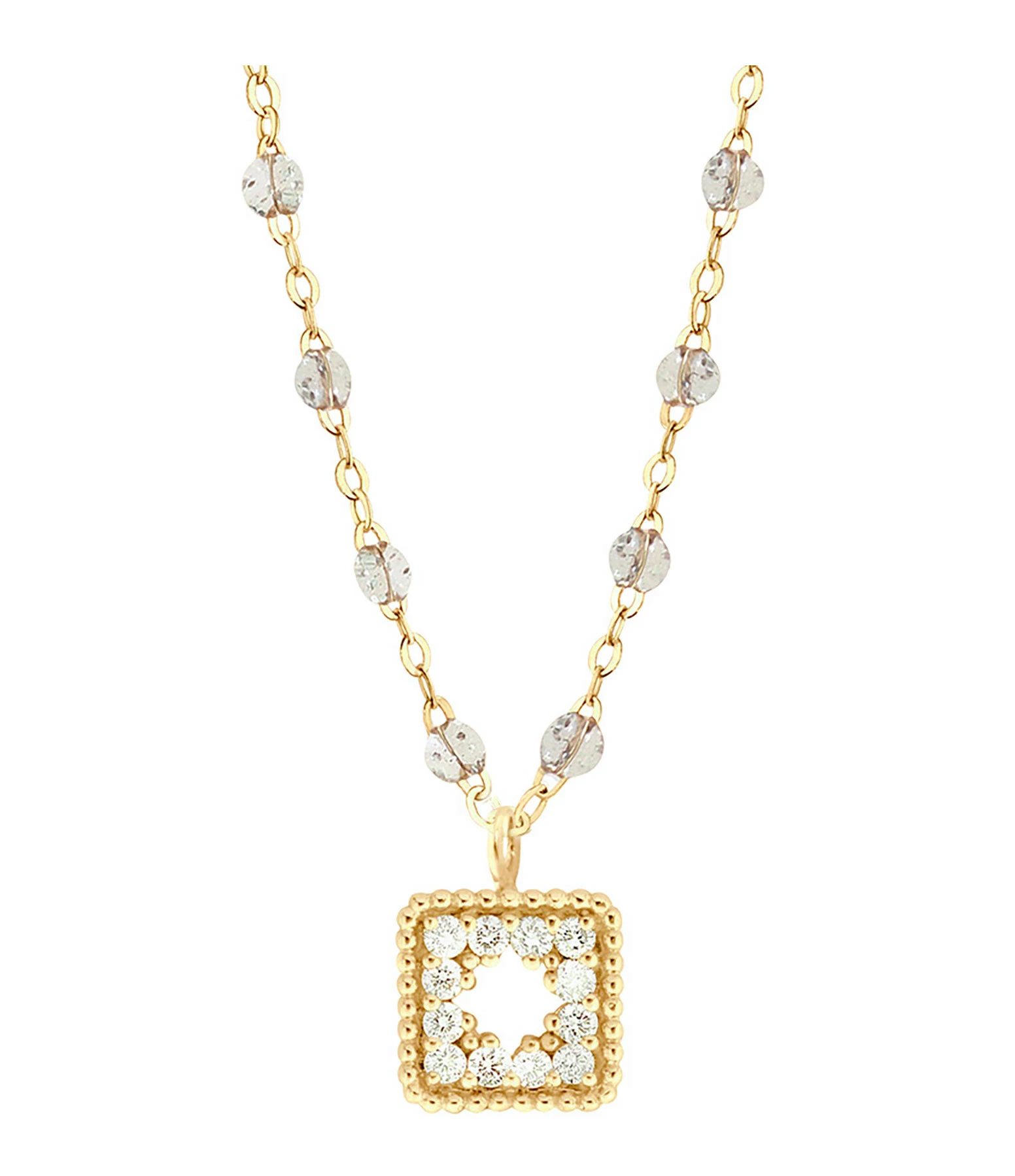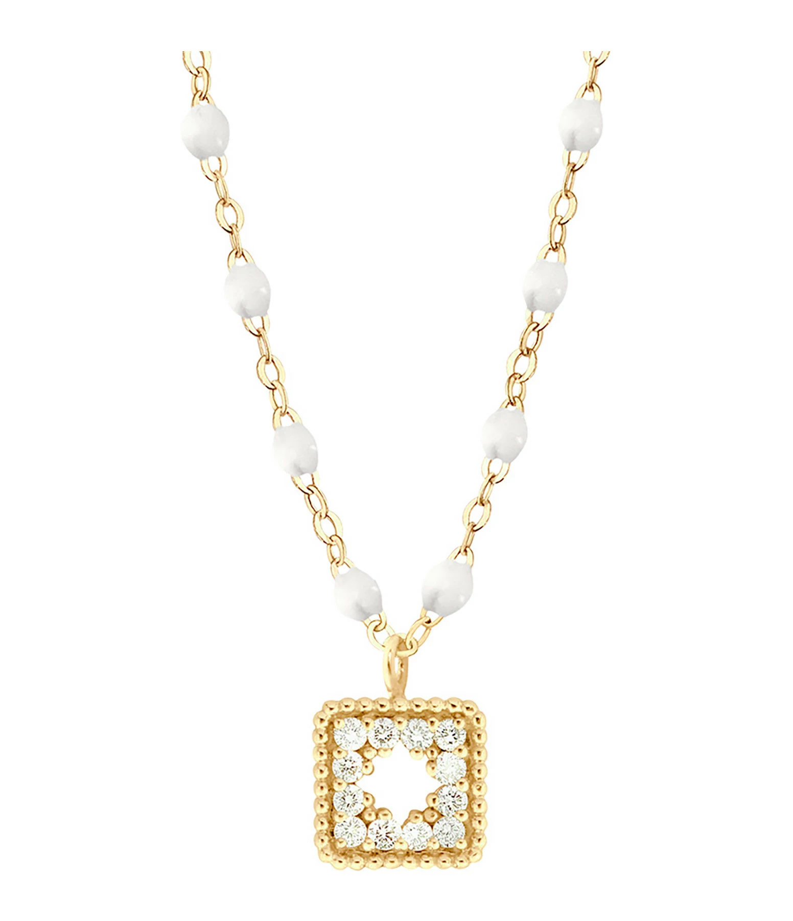 Collier sur chaîne en or jaune agrémenté d’un pendentif serti de diamants et de mini perles de résine. Fermoir classique à ressort avec contre-anneau.