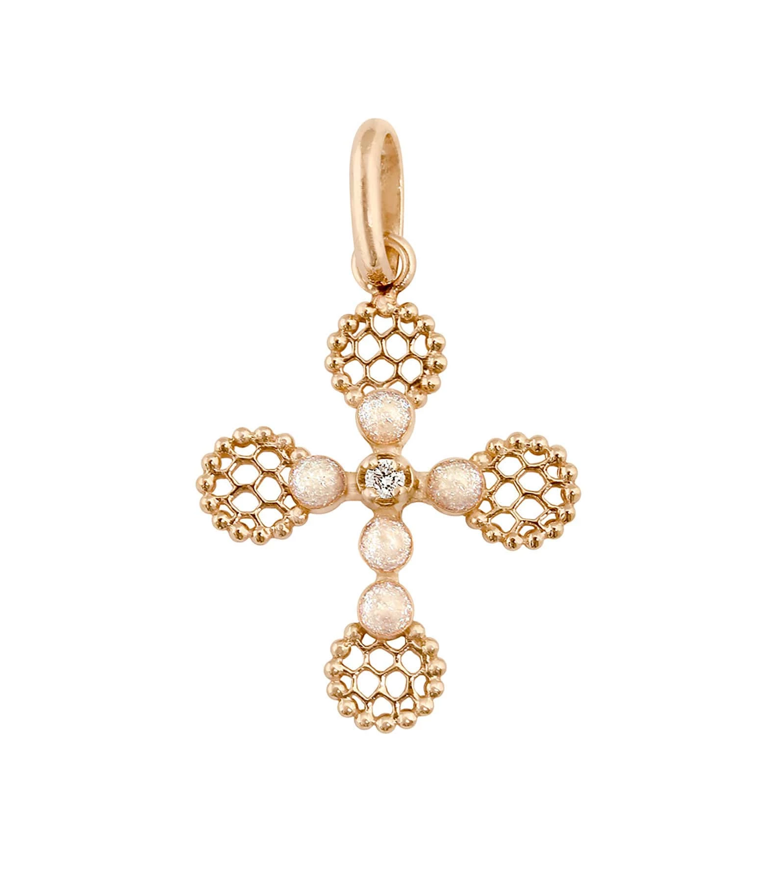 Pendentif Croix en or rose serti de un diamant blanc et perles de résine.