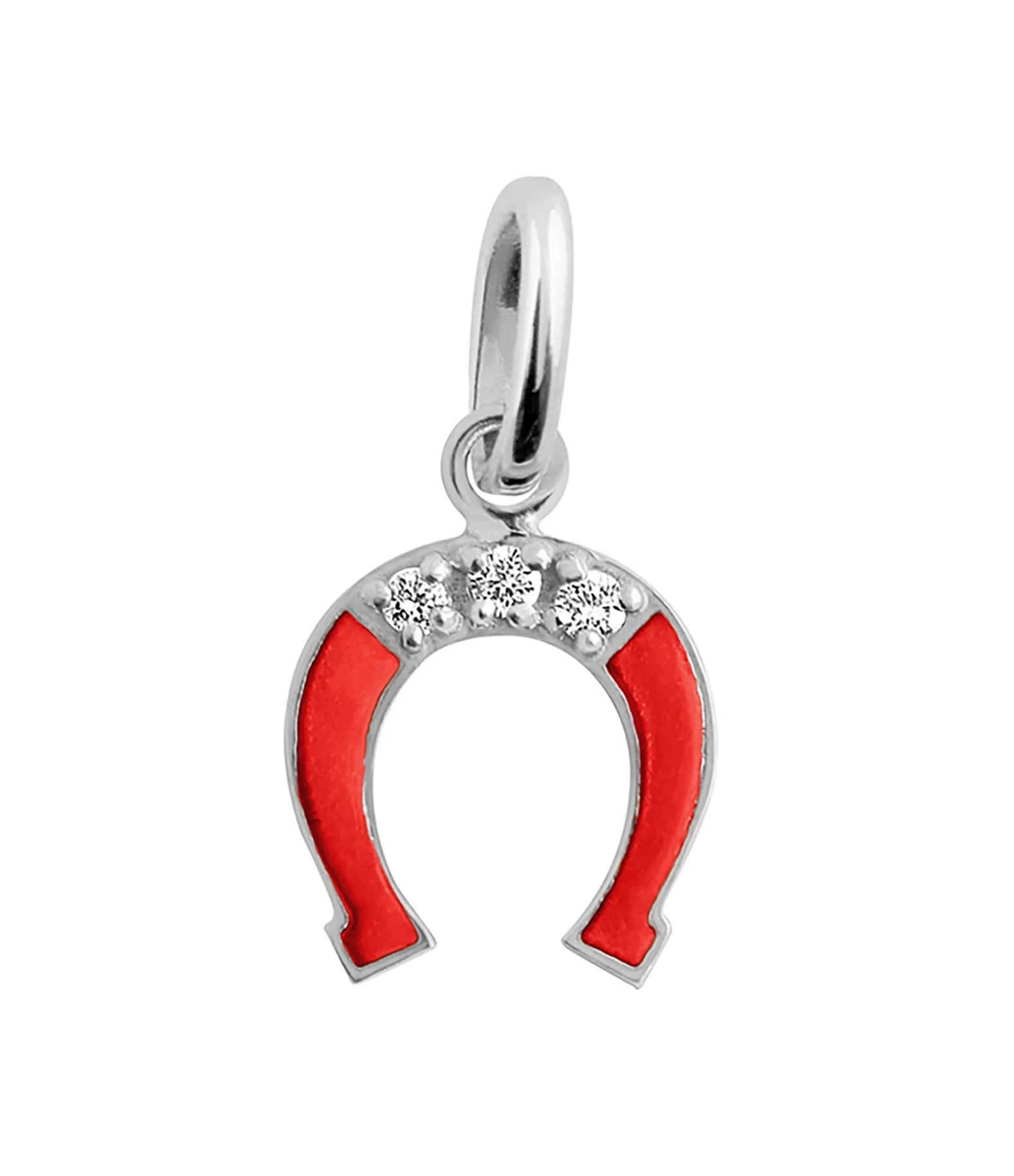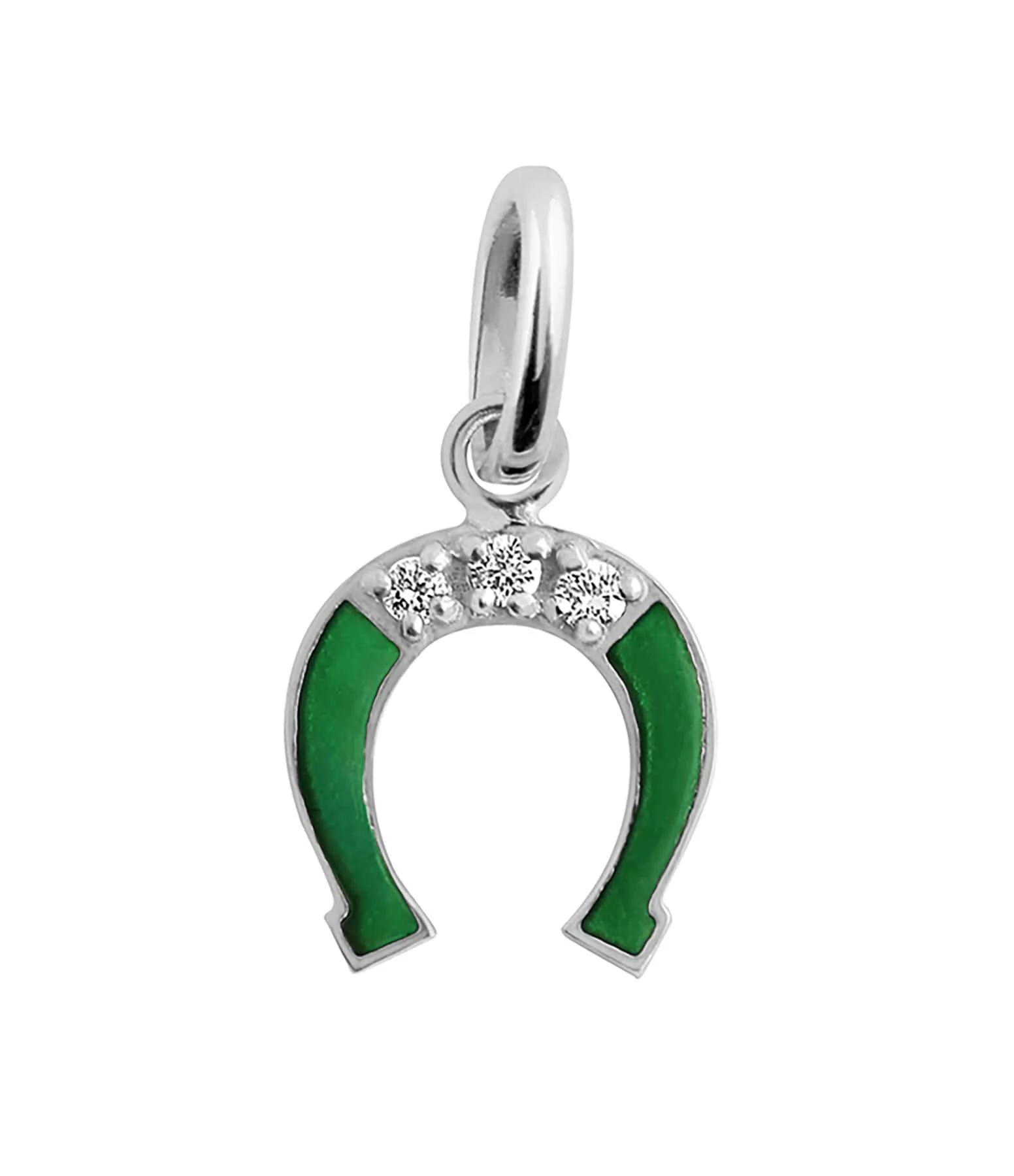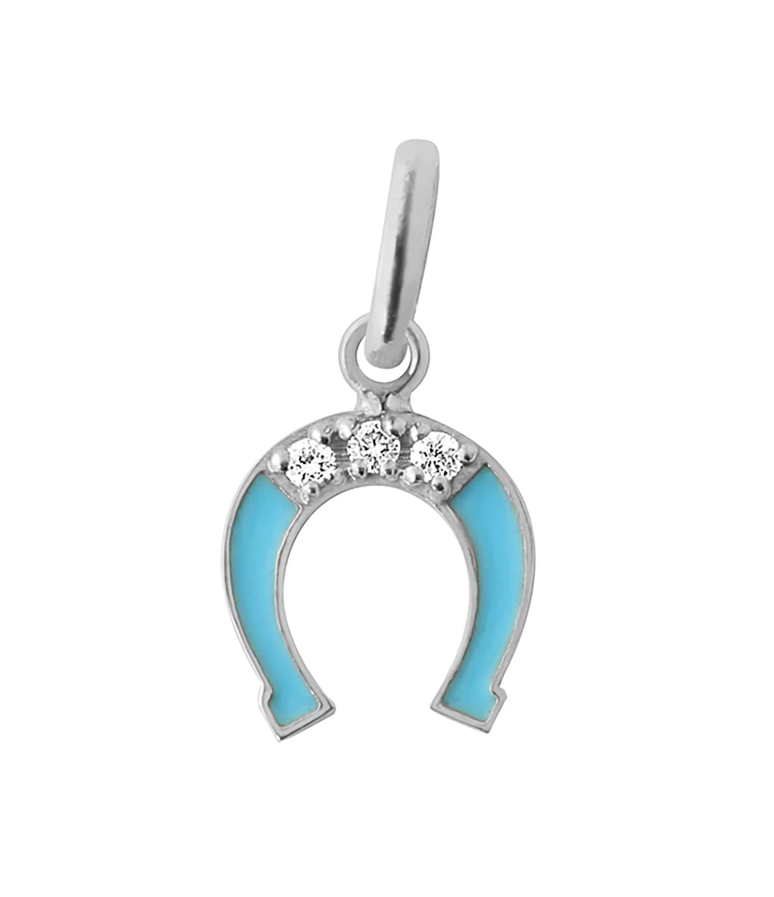 Pendentif en or blanc en forme de fer à cheval avec résine de couleur serti de trois diamants.
