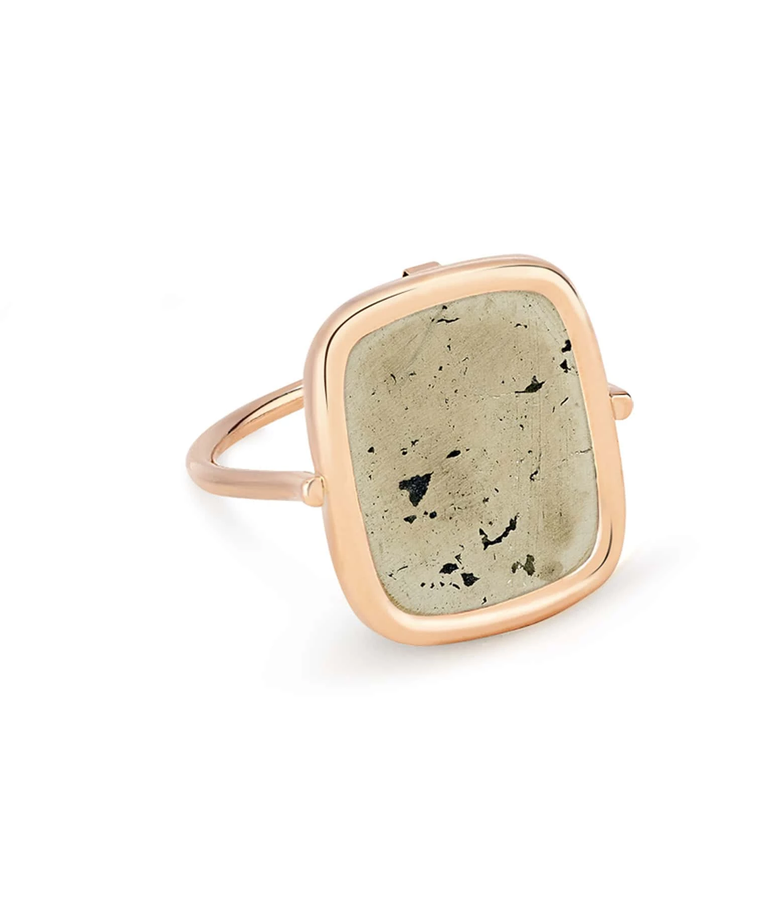 Bague en or rose avec motif carré moucheté et légèrement irisé en pyrite.