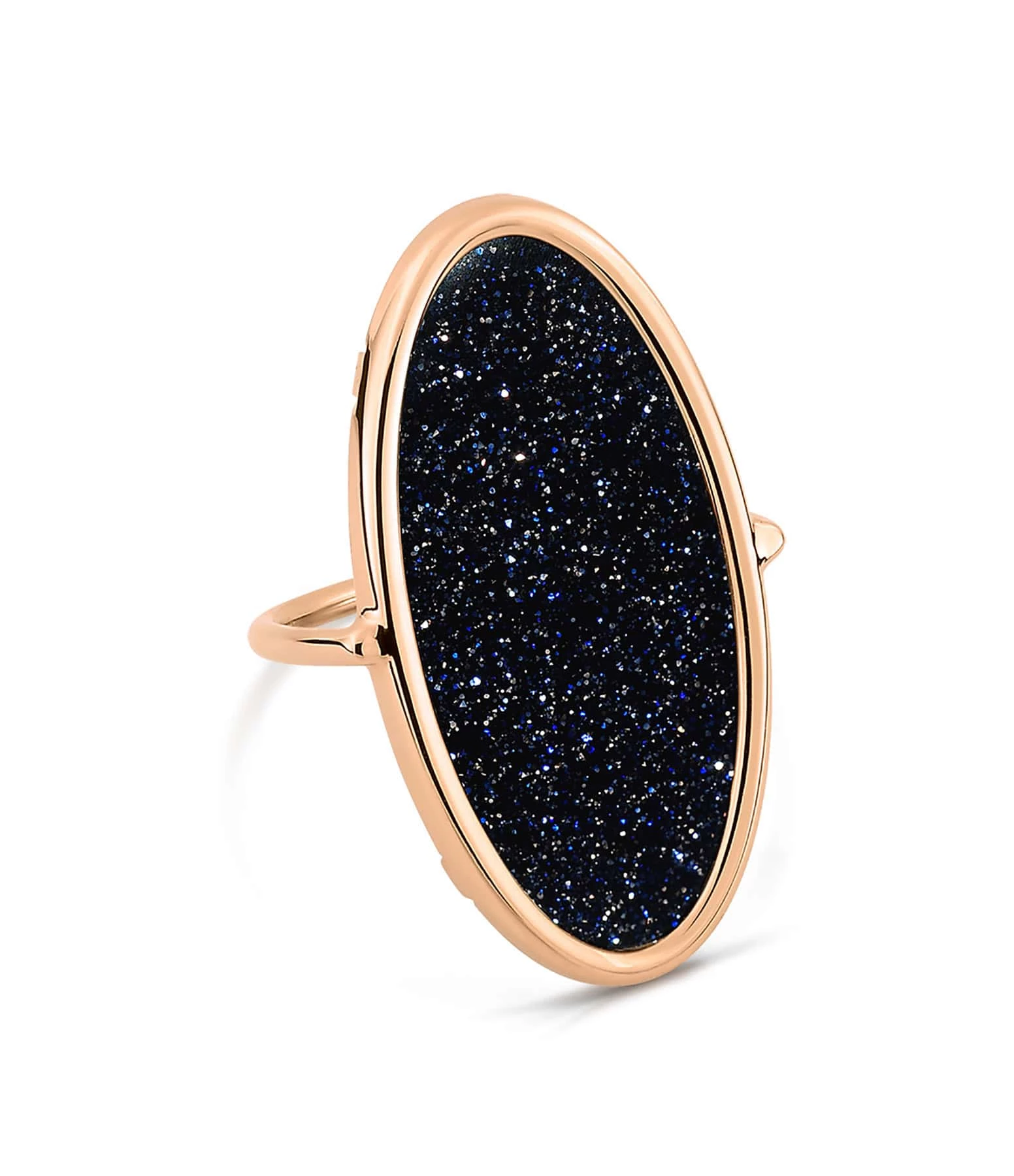 Bague en or rose avec motif ovale en pierre de sable bleu.