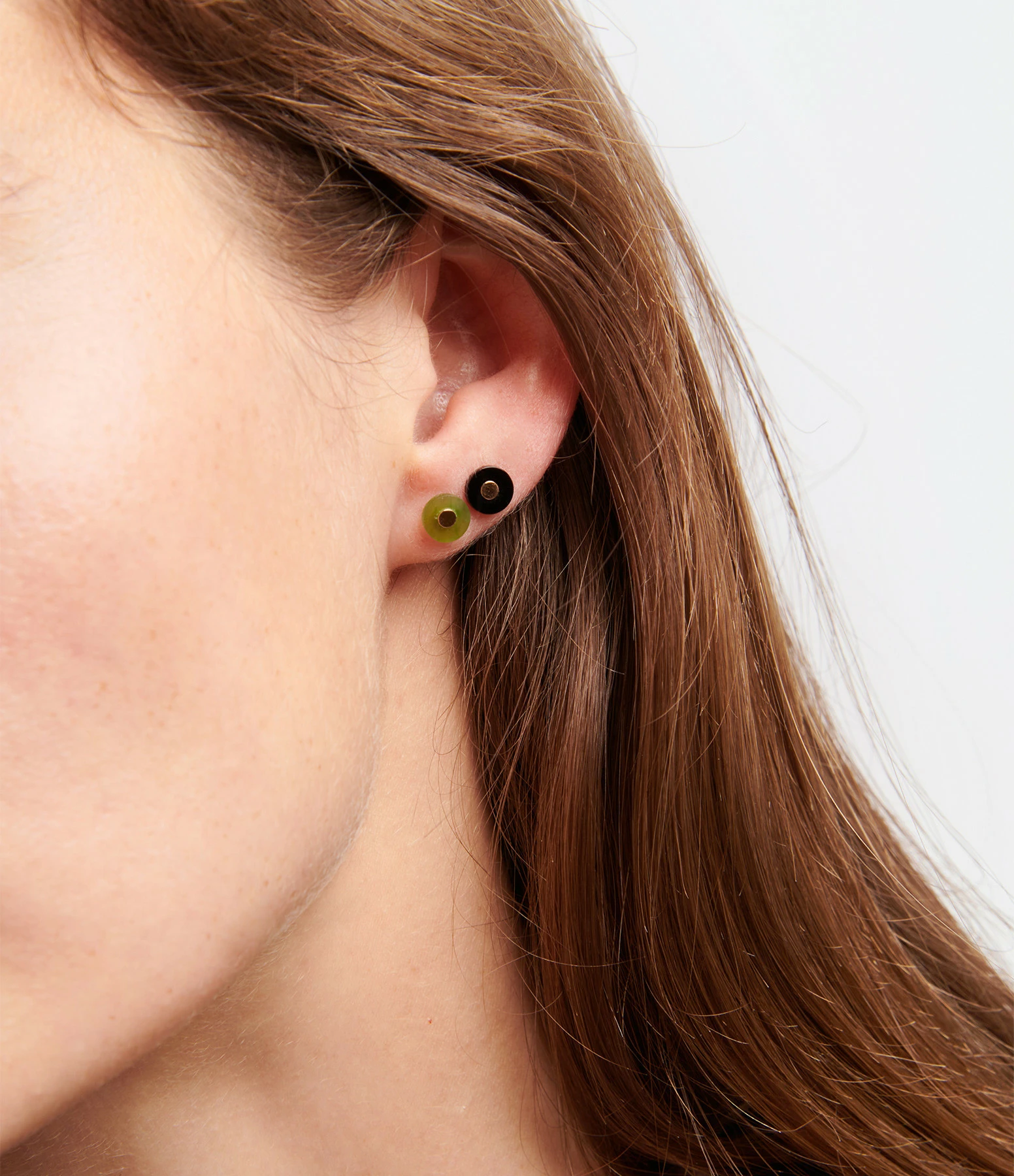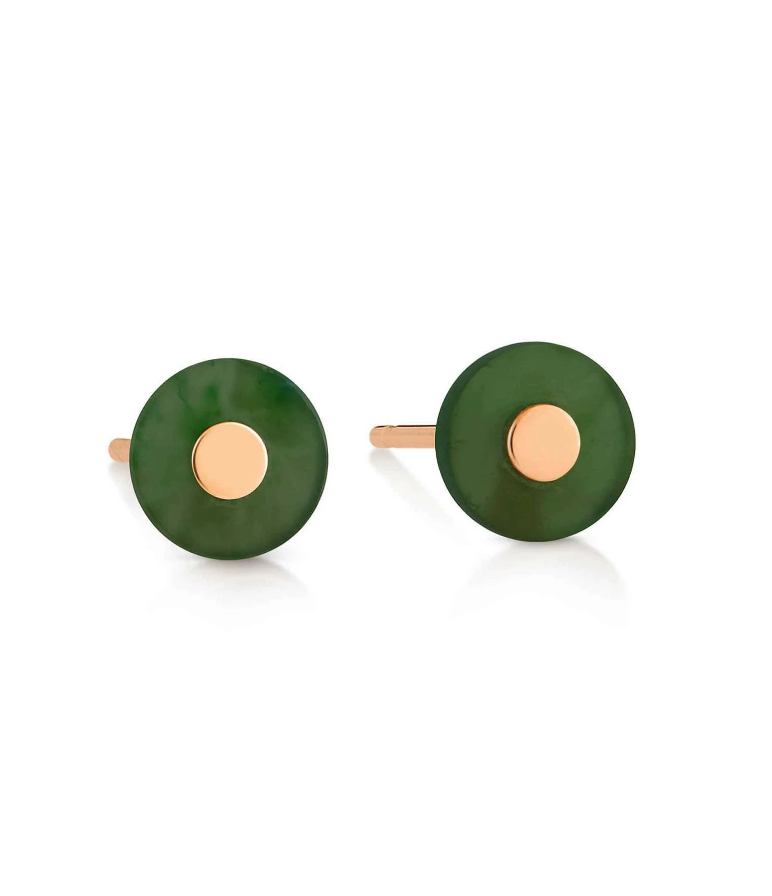 Boucles d’oreilles puces avec mini disque en pierre de jade verte. Fermoir poussette.