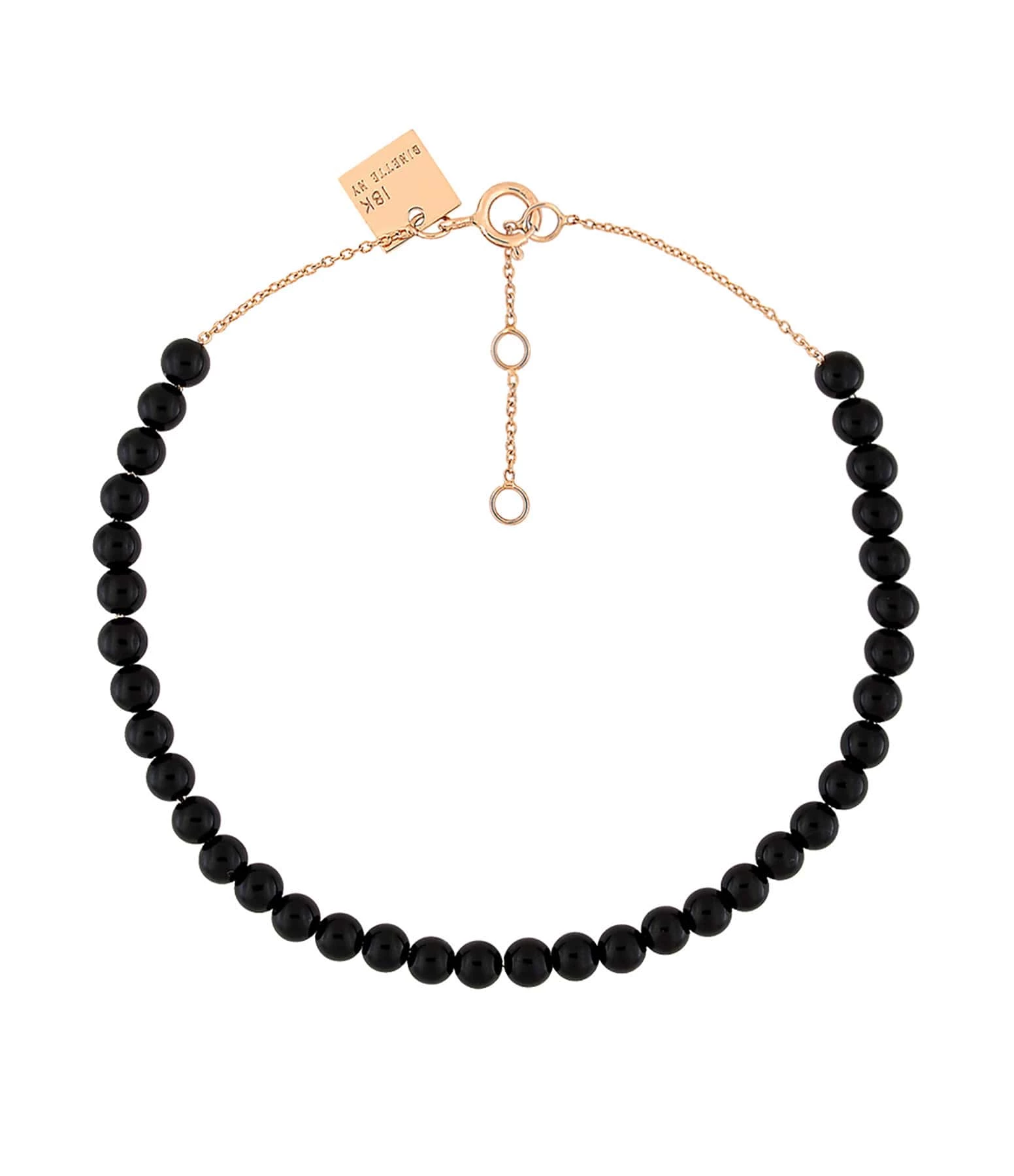 Bracelet sur chaîne en or rose agrémenté de pierres d’onyx. Fermoir classique à ressort avec contre-anneau.