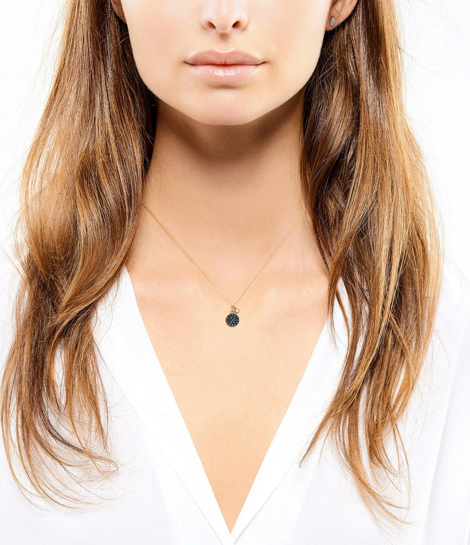 Collier sur chaîne en or rose avec pendentif serti de diamants noirs. Fermoir classique à ressort.