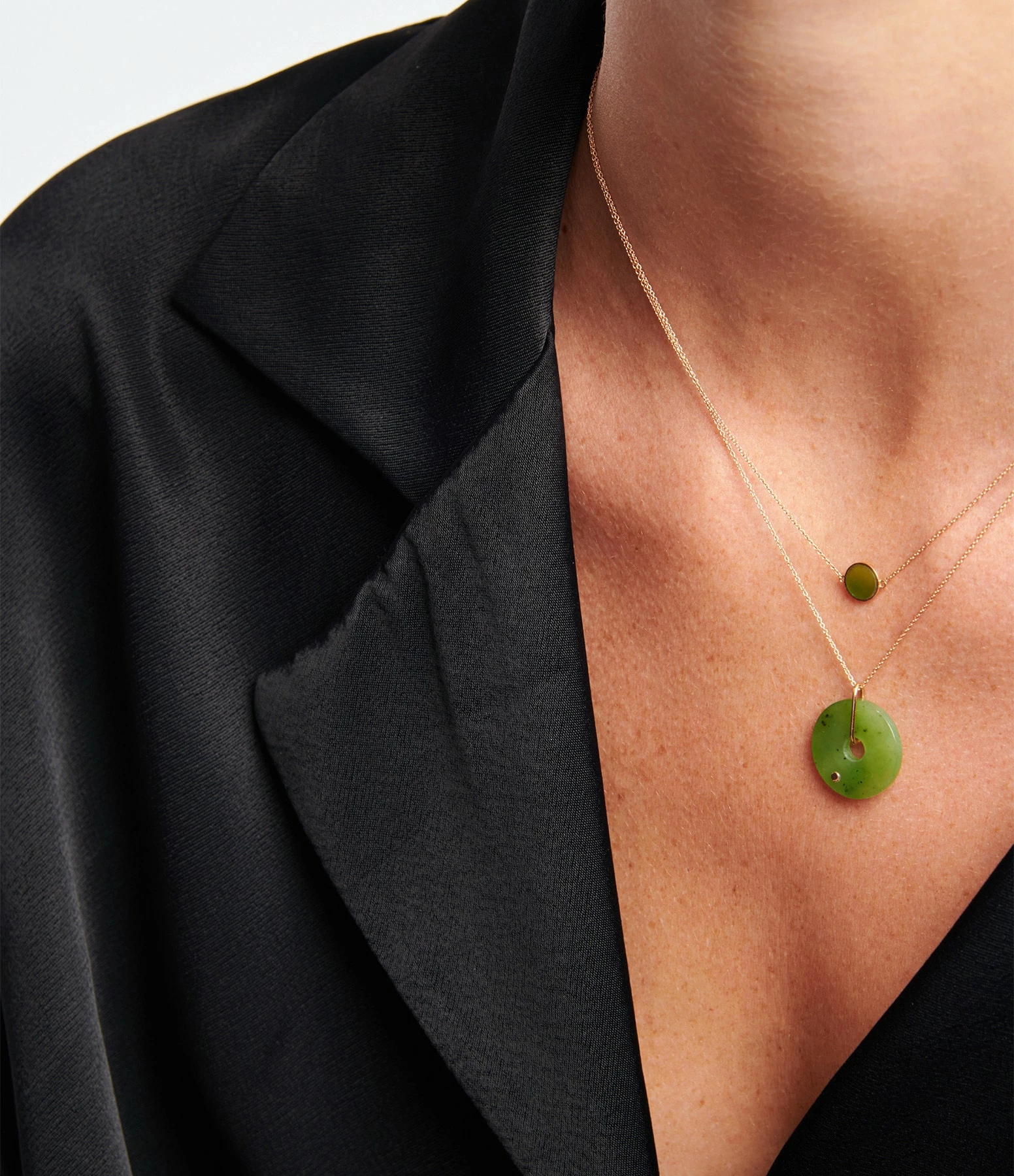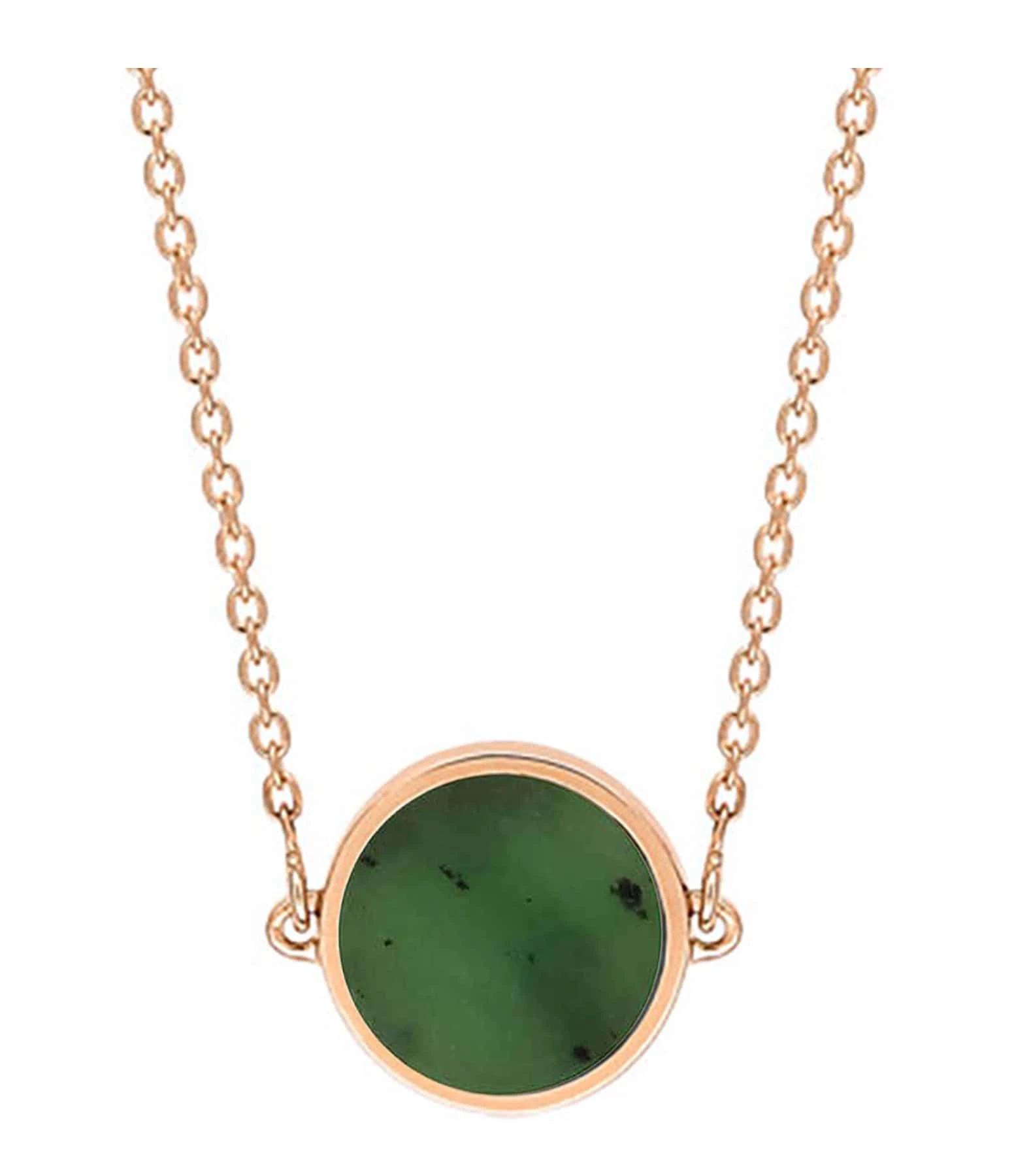 Collier sur chaîne en or rose avec pendentif en jade verte. Fermoir classique à ressort avec contre-anneau.