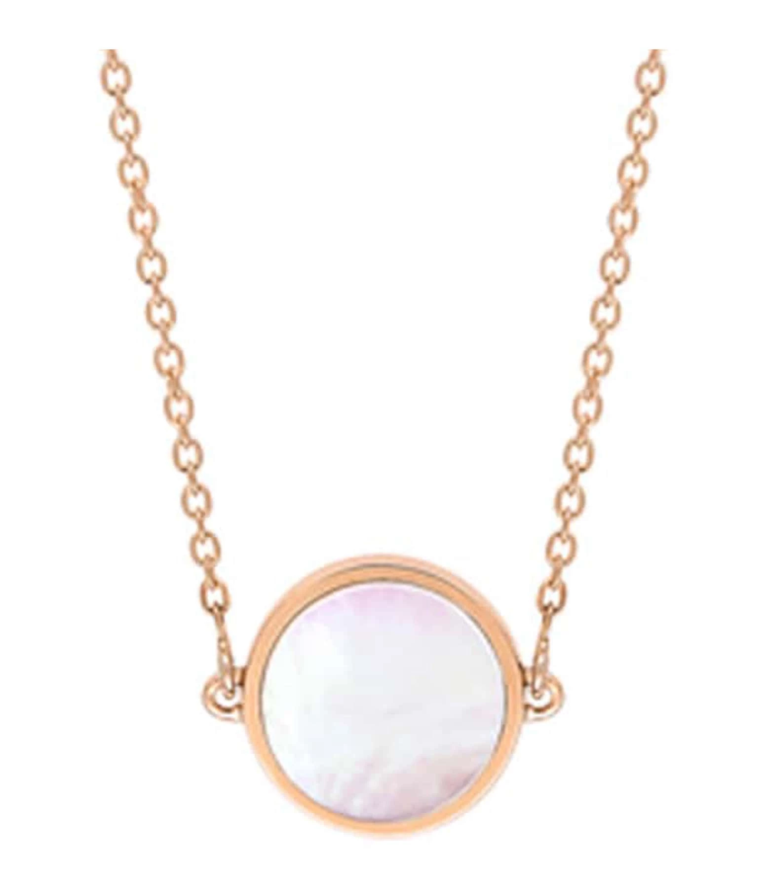 Collier sur chaîne en or rose avec pendentif en Nacre rose. Fermoir classique avec contre-anneau et ressort.