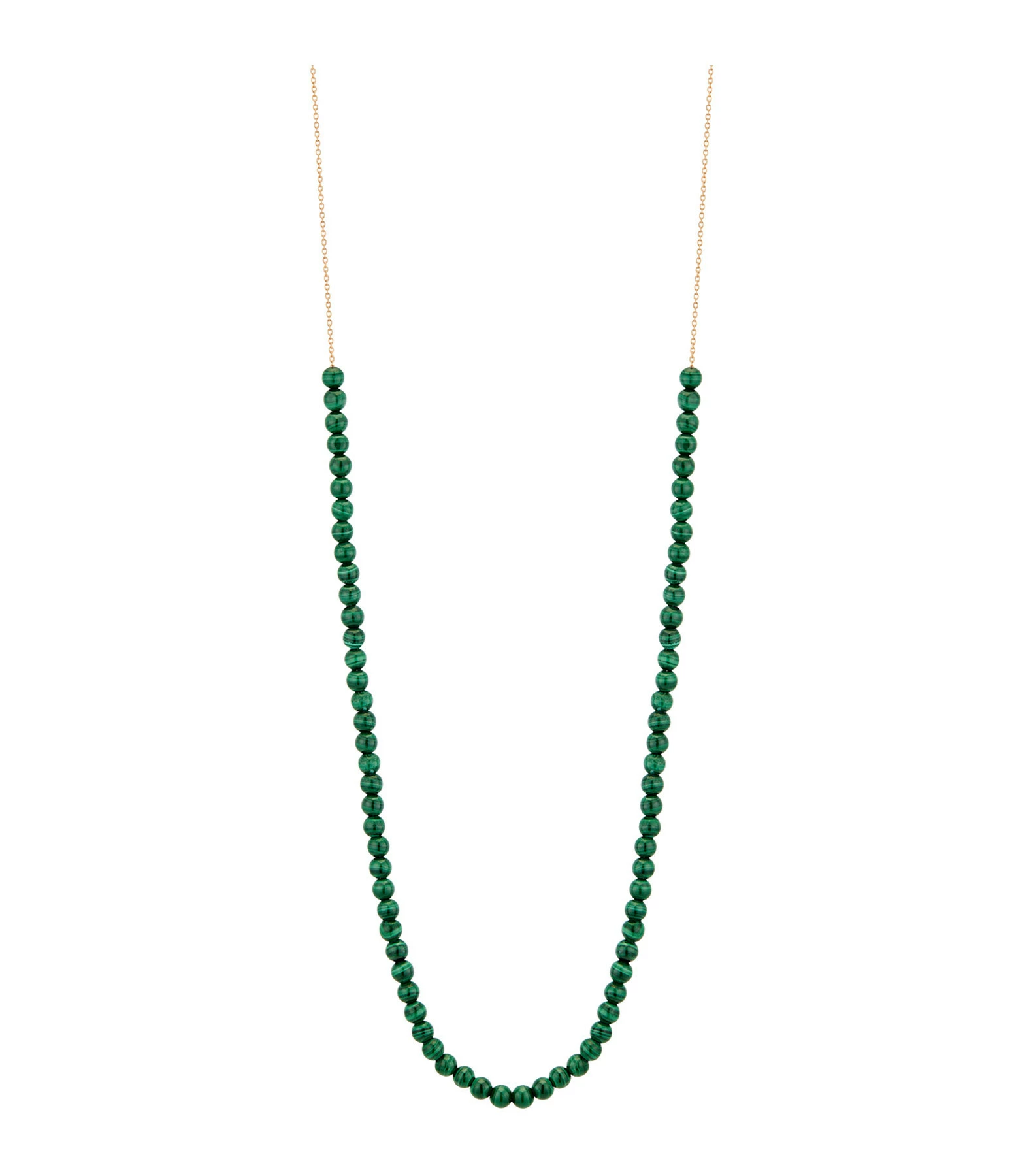 Collier sur chaîne en or rose agrémenté de pierres de malachite verte. Fermoir classique à ressort avec un contre-anneau.