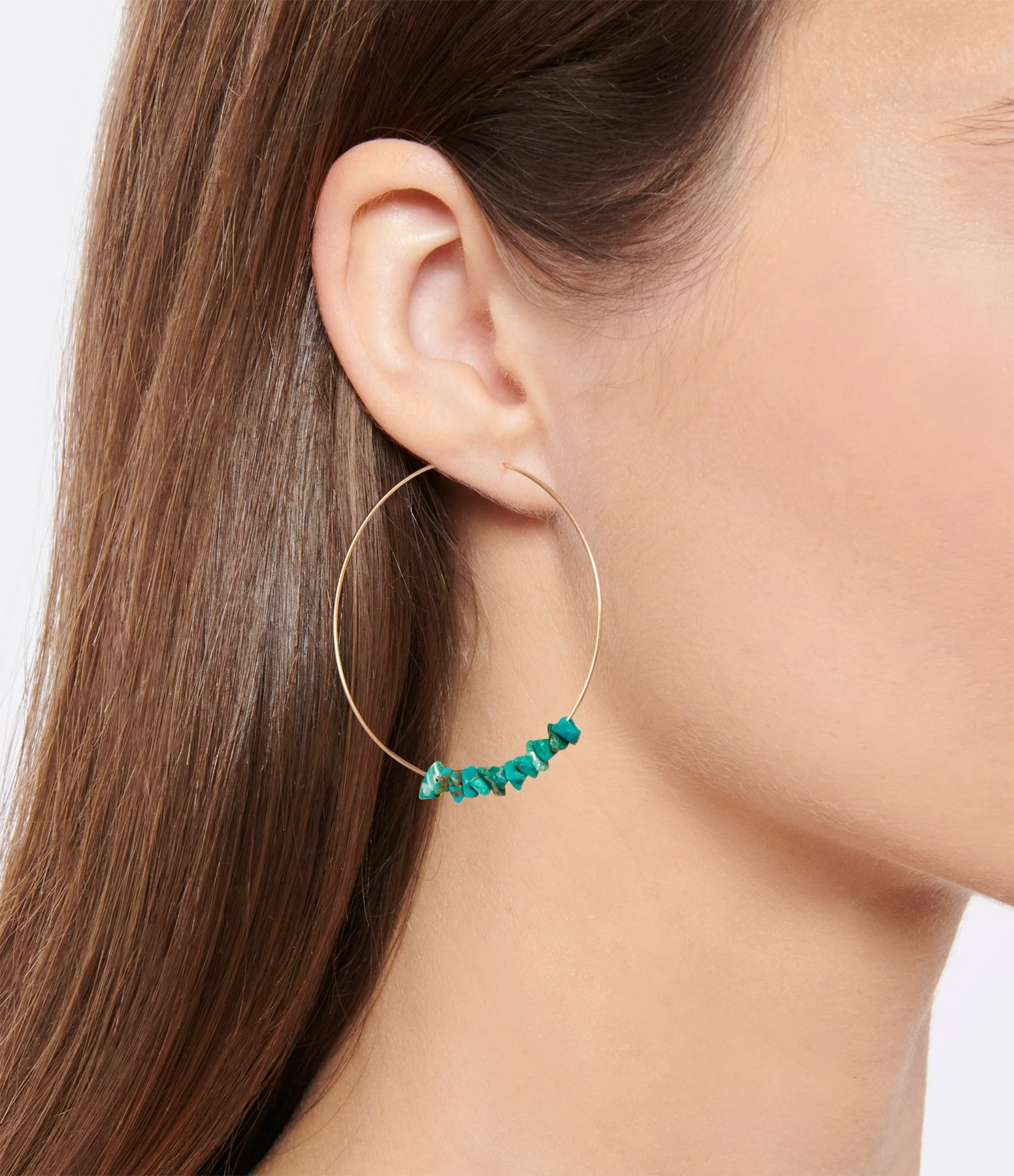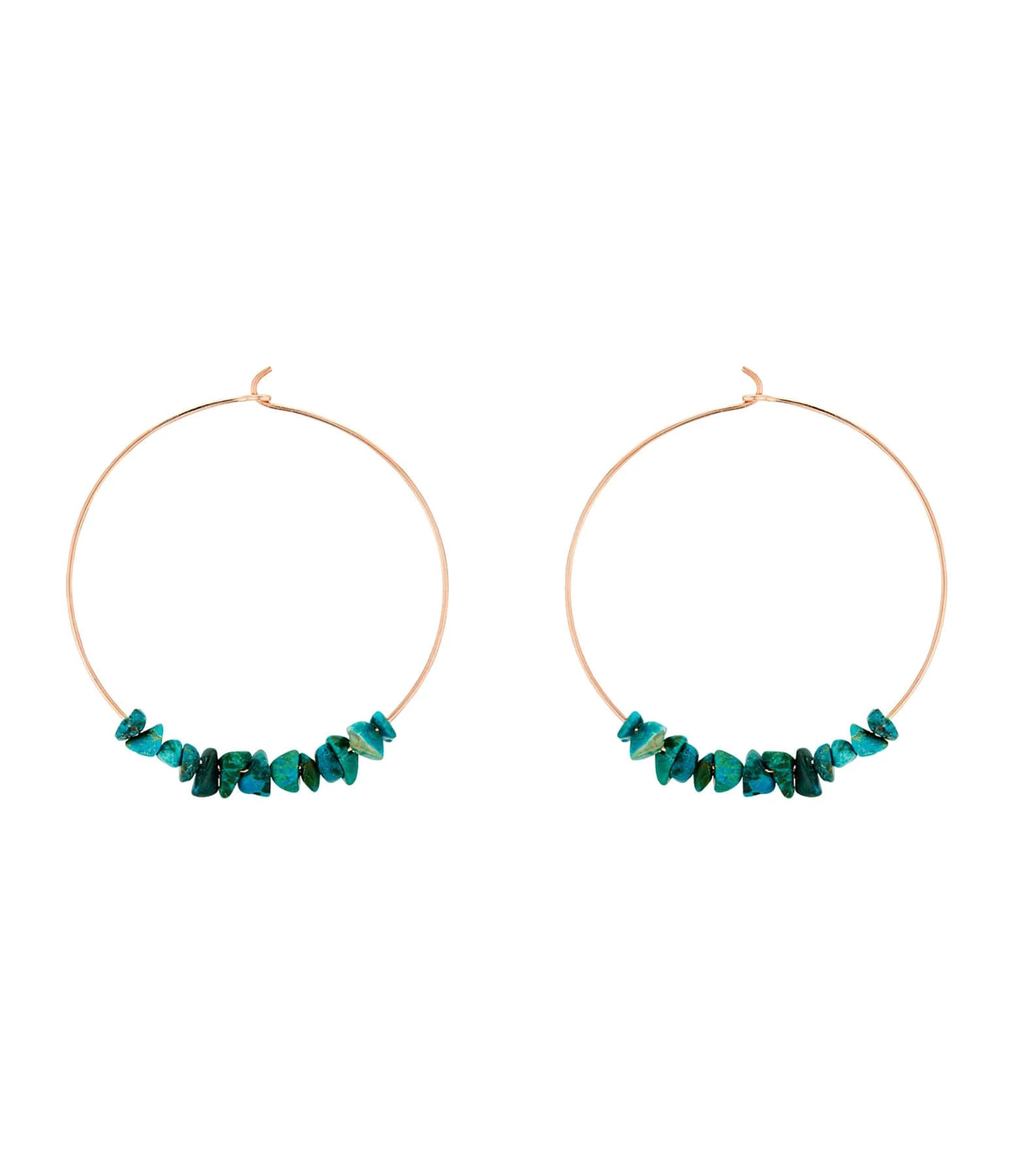 Créoles en or rose avec pampilles en chrysocolle verte. Fermoir à cliquet.